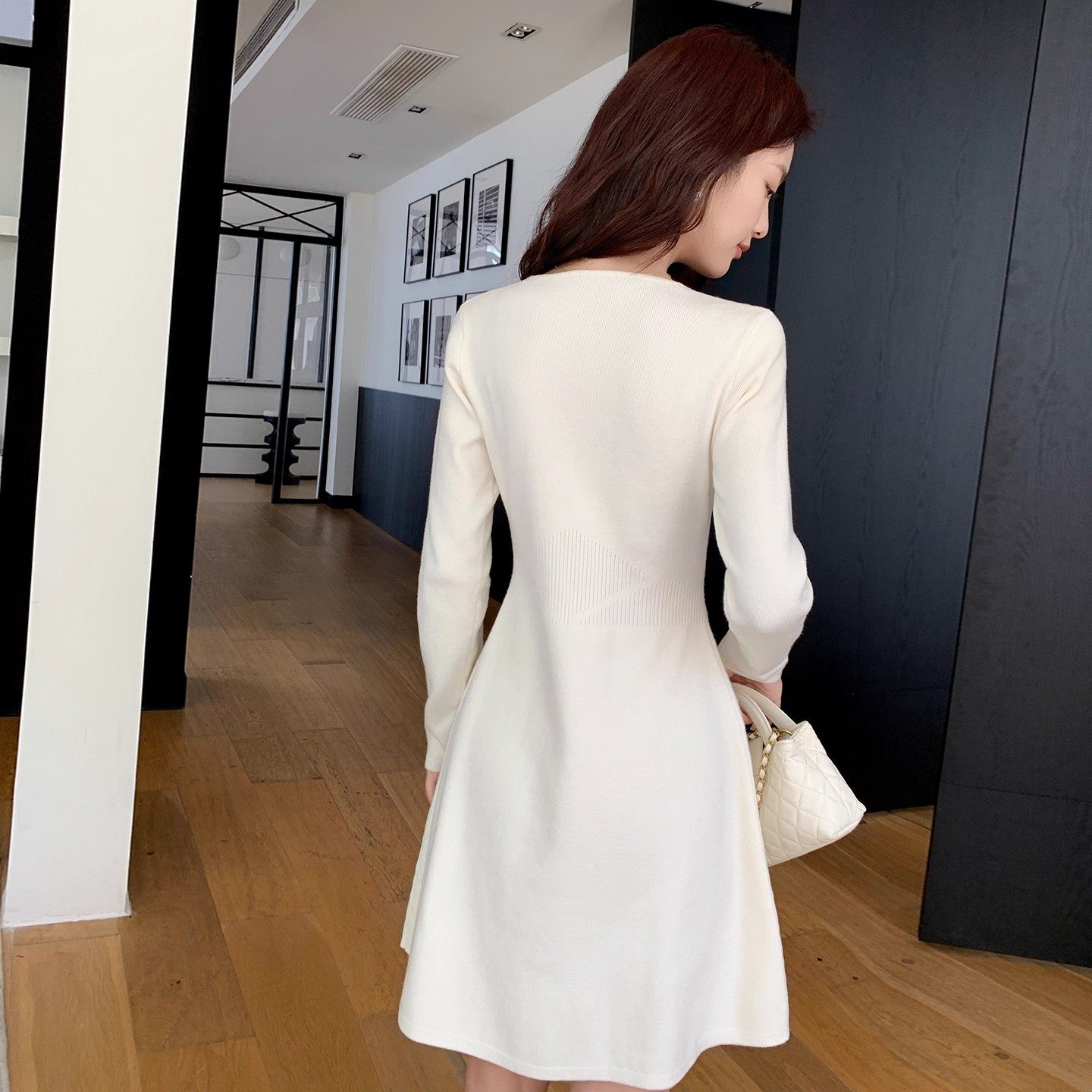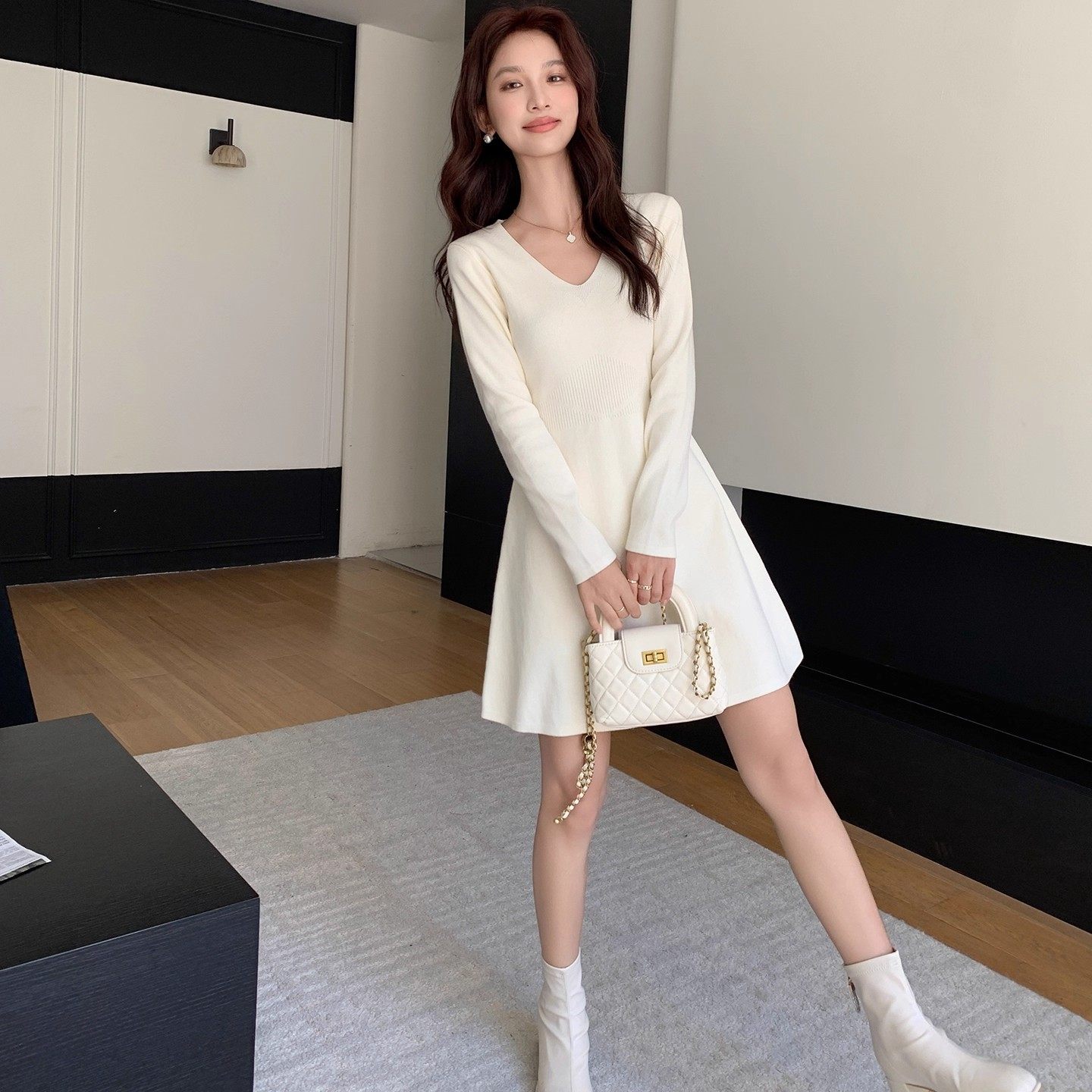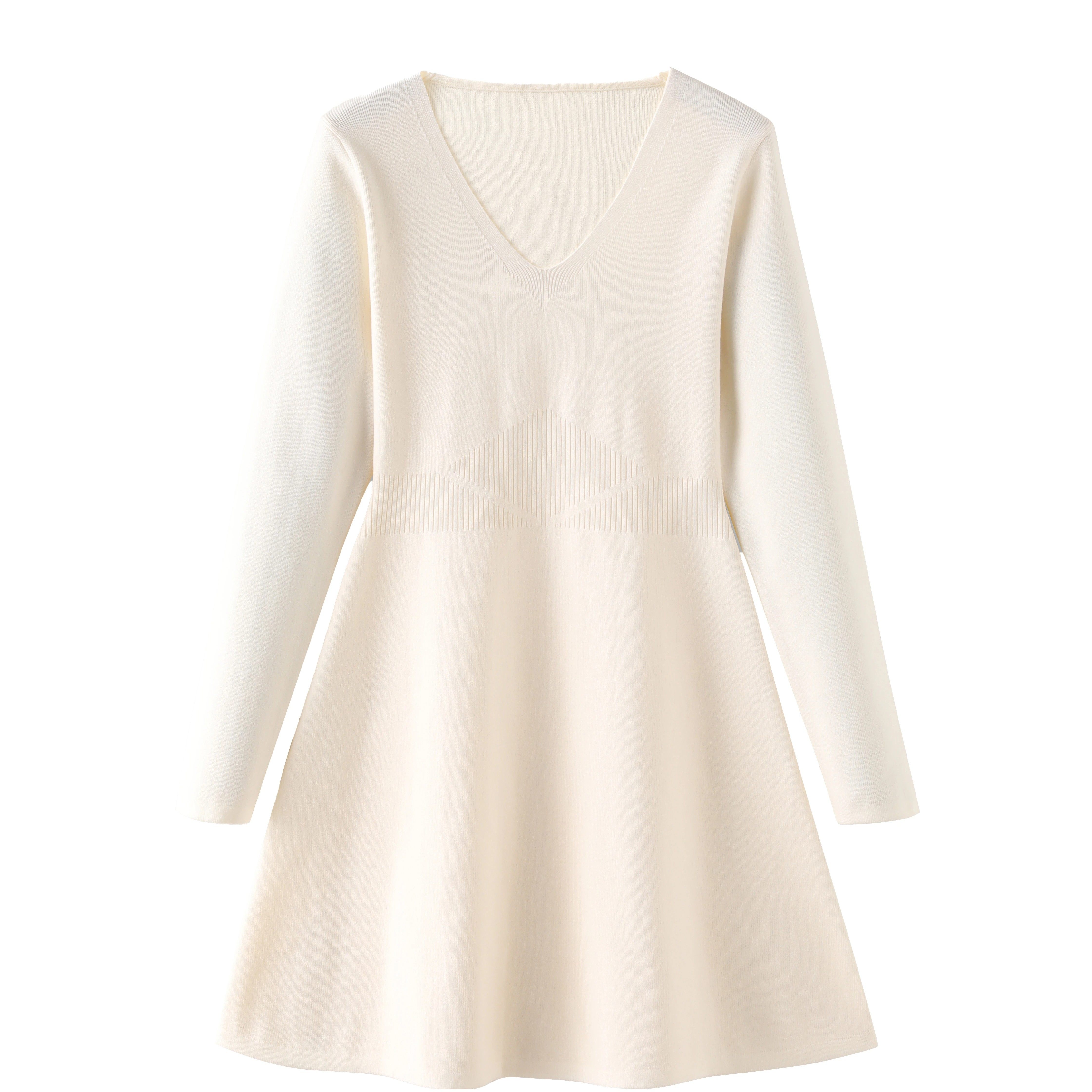 法式高级感白色V领打底针织连衣裙女早秋裙子秋冬配大衣内搭毛衣