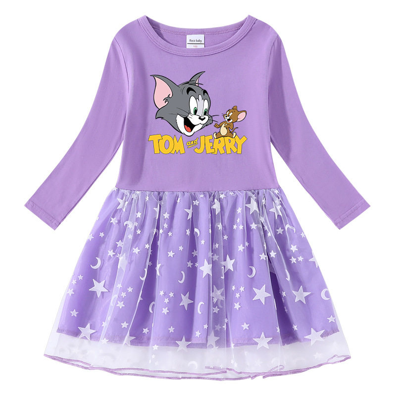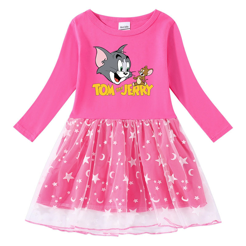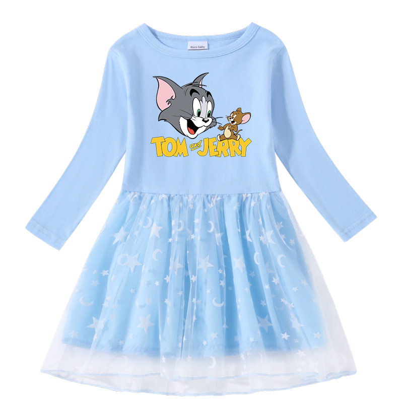 女童春季长袖连衣裙儿童猫和老鼠春秋薄款网纱裙子小女孩卡通童装