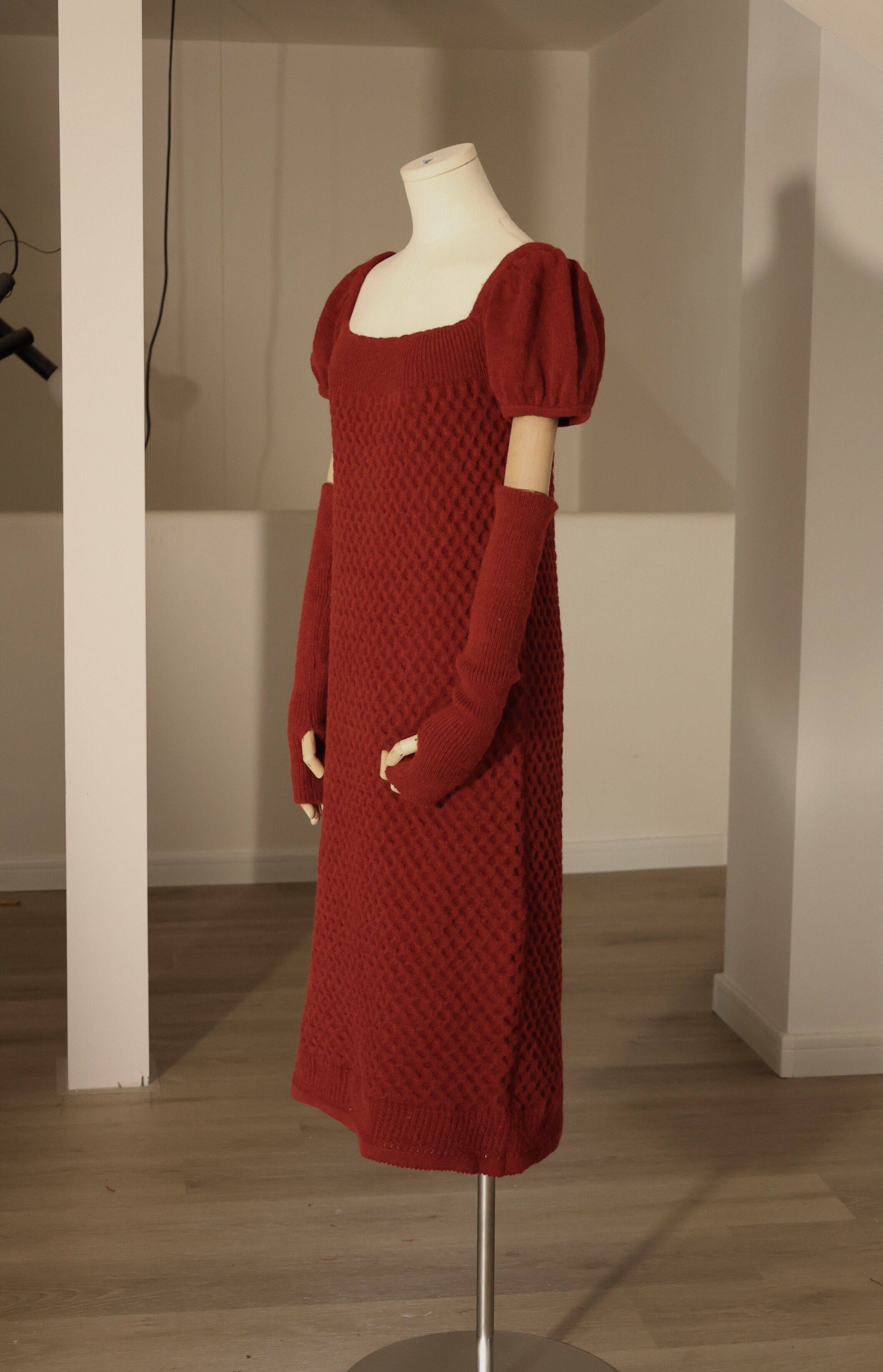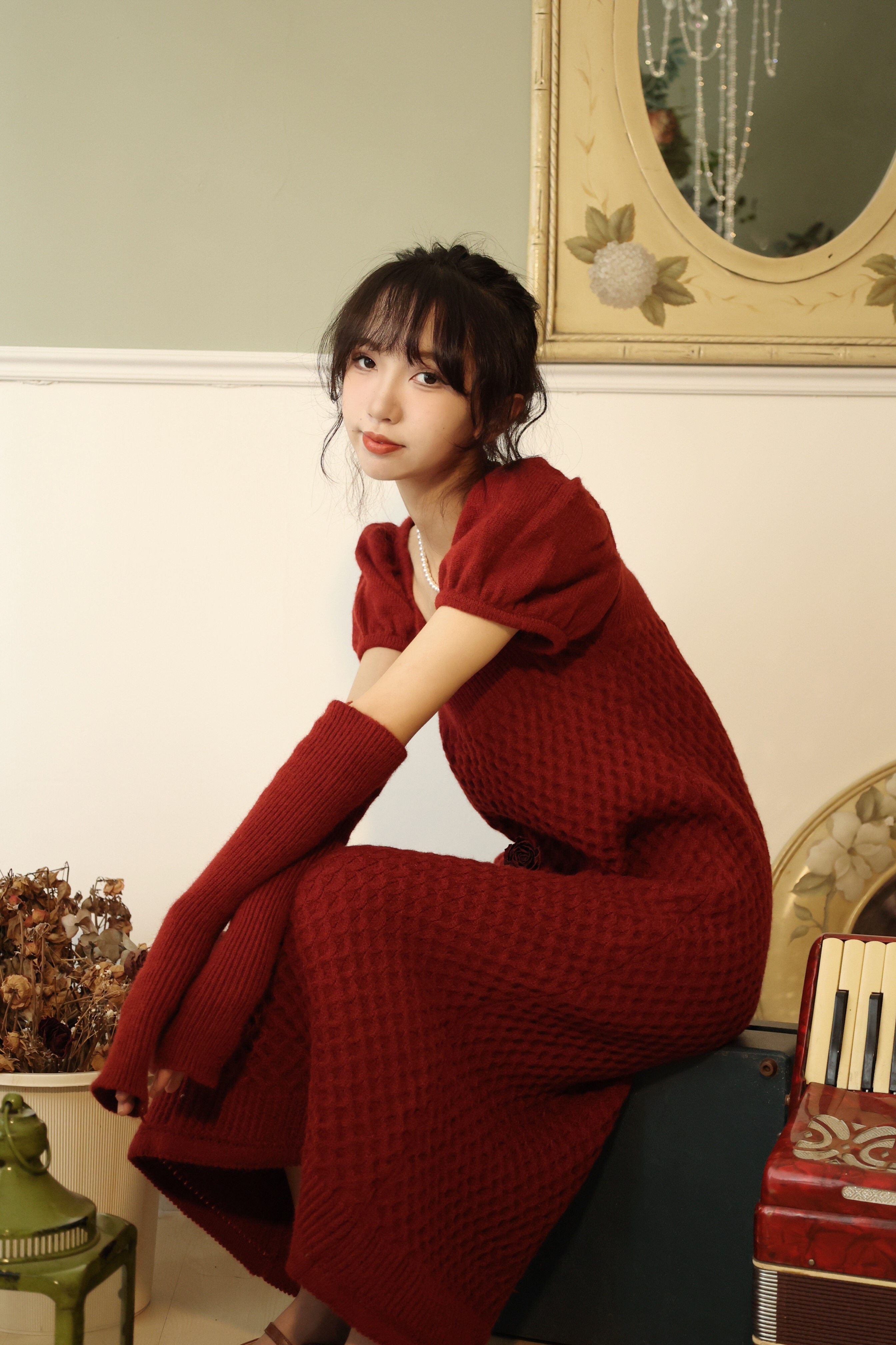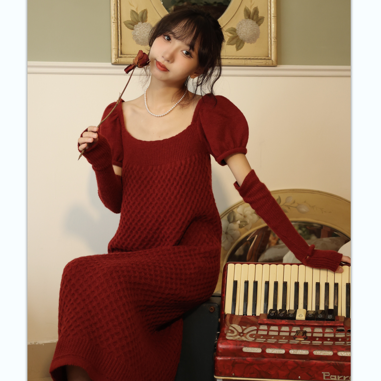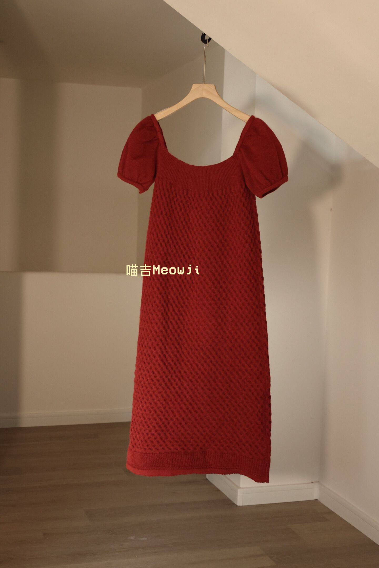 喵吉复古方领长款过膝打底毛衣裙小个子内搭红色针织连衣裙女秋冬