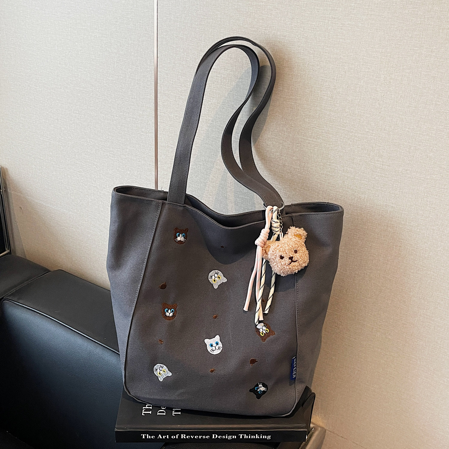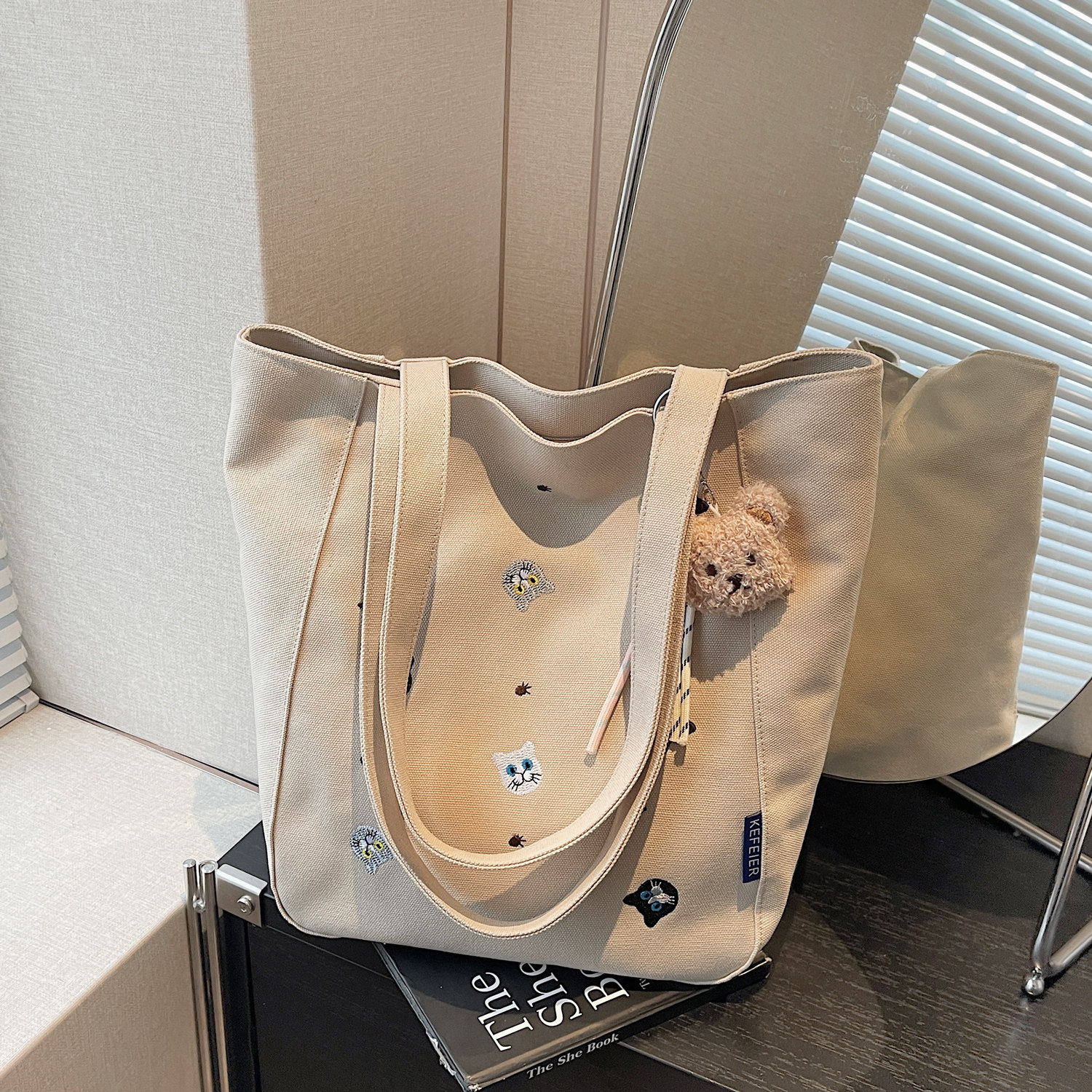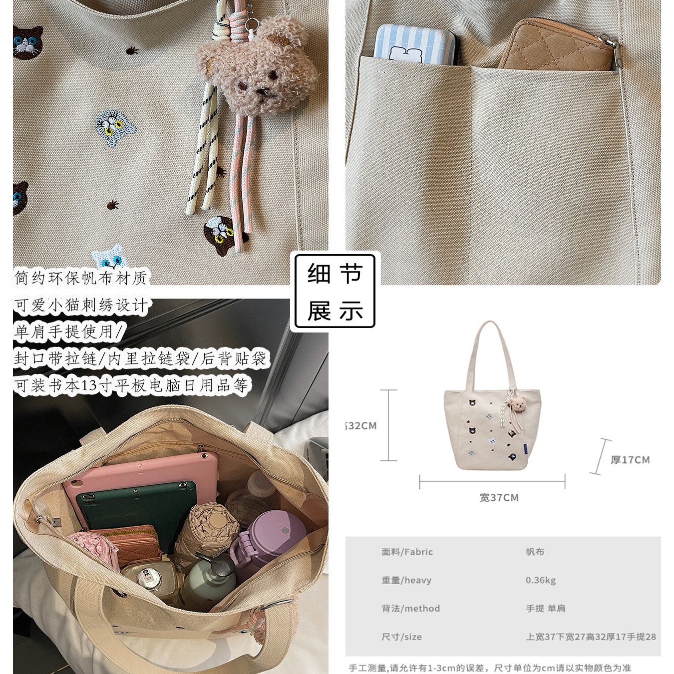 带拉链帆布包包女式大容量可爱猫刺绣包休闲托特包日常通勤单肩包