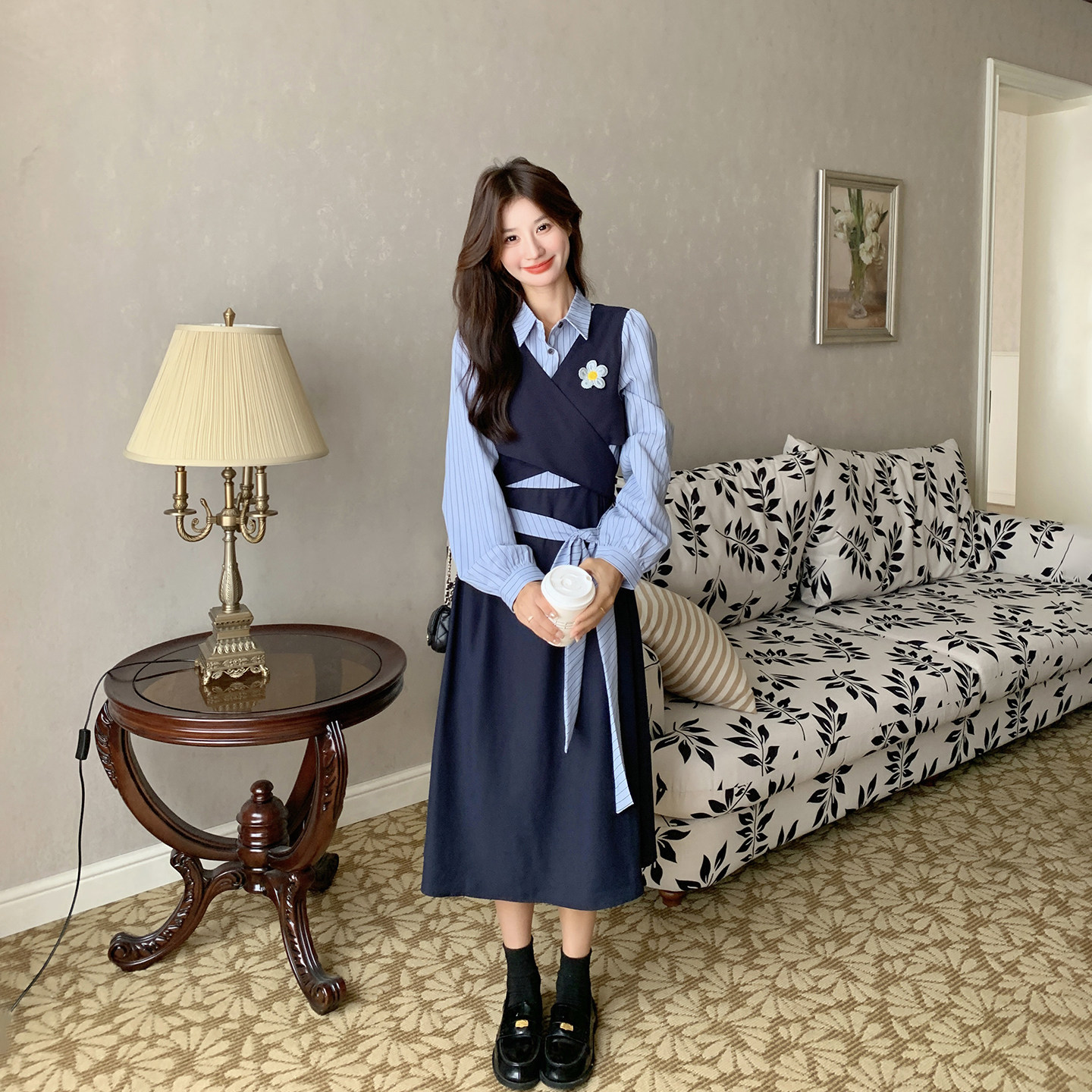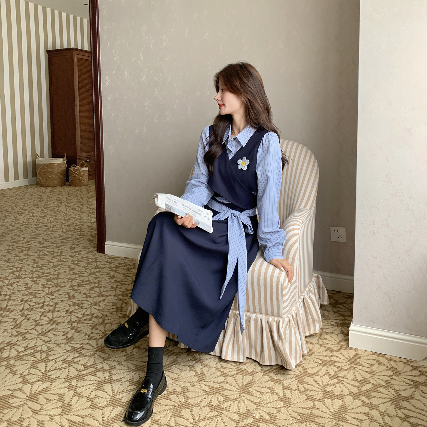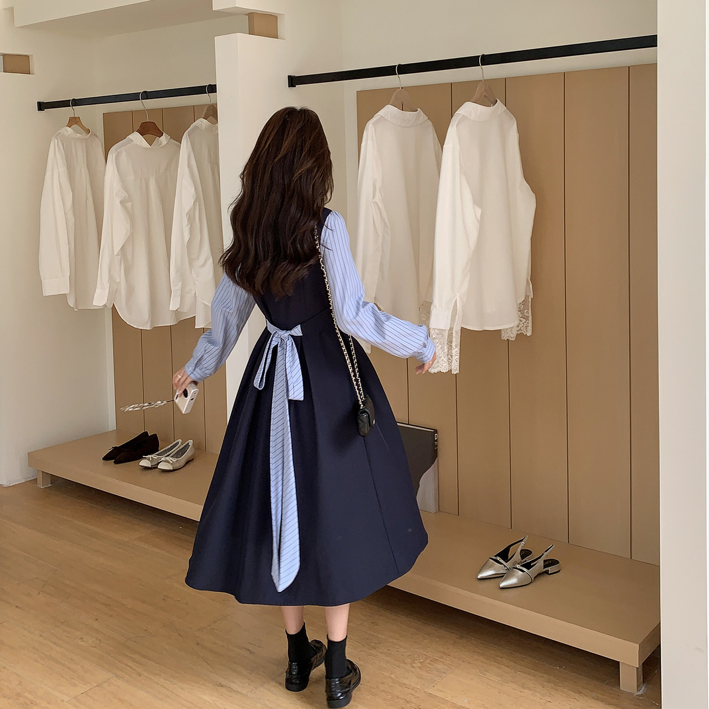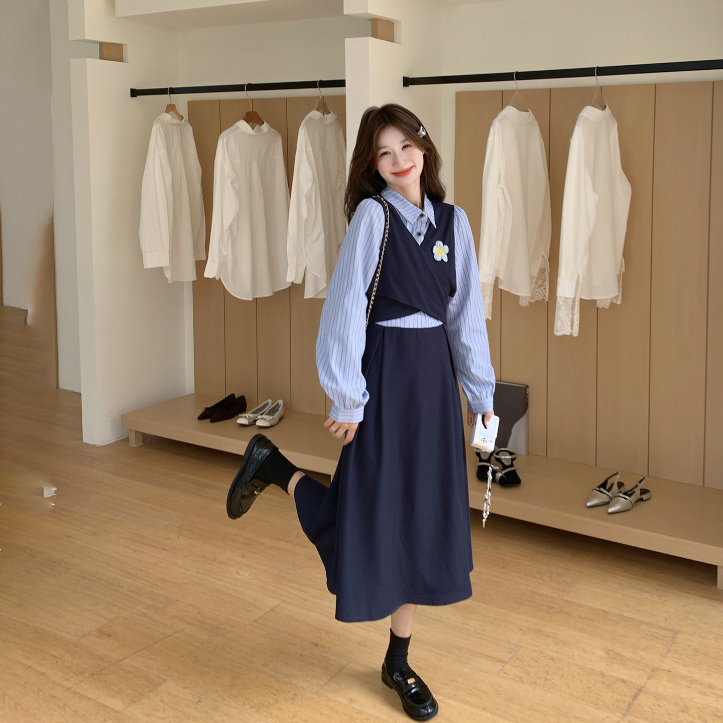 学院风拼接假两件条纹连衣裙女春季2026新款今年流行爆款衬衫长裙