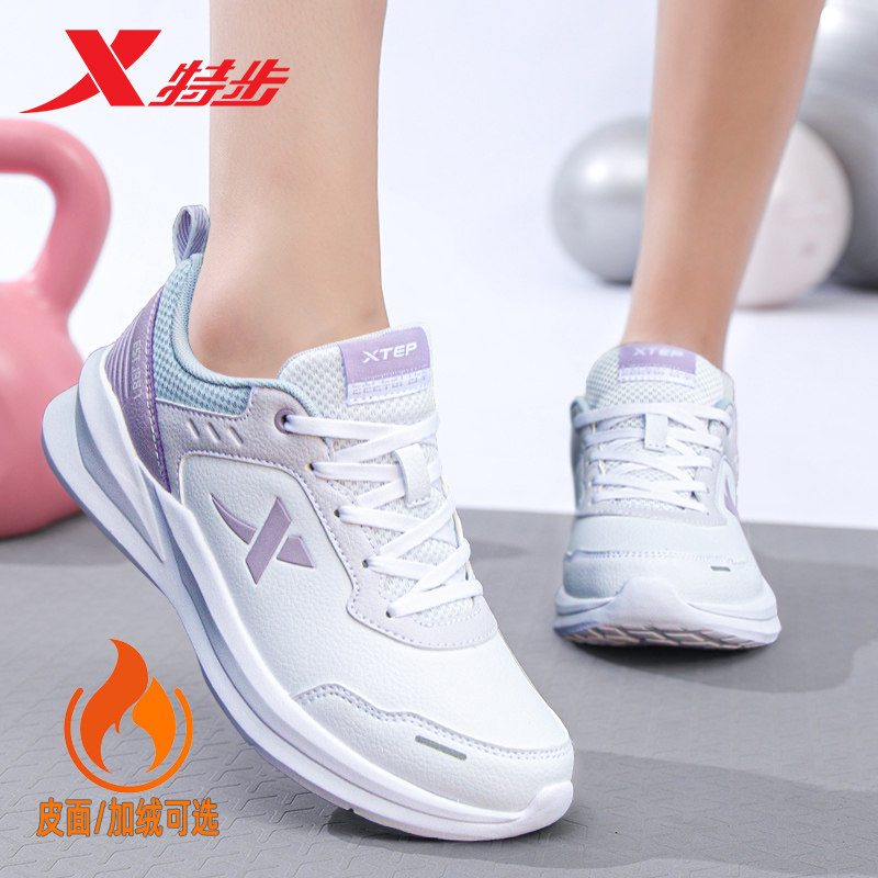 特步女鞋棉鞋女加绒加厚保暖跑步鞋皮面防水冬季运动鞋女休闲鞋子