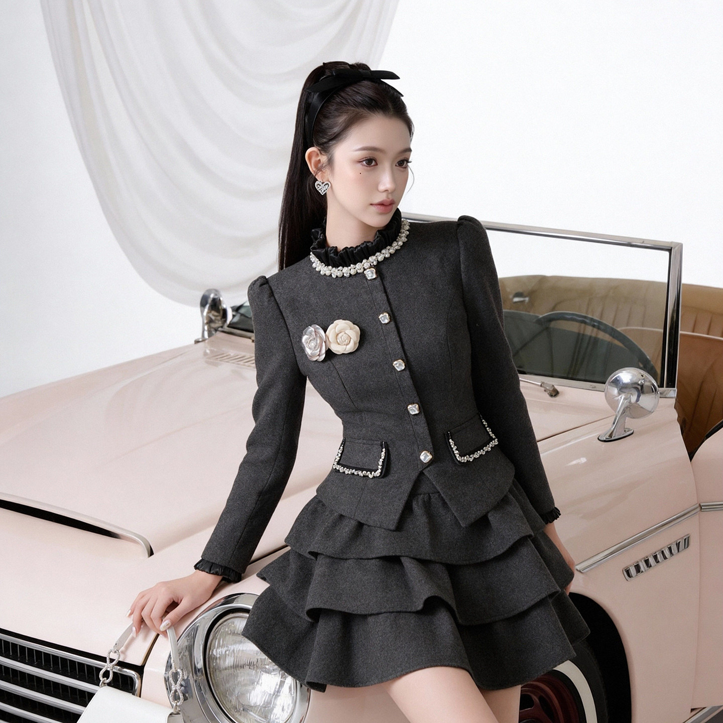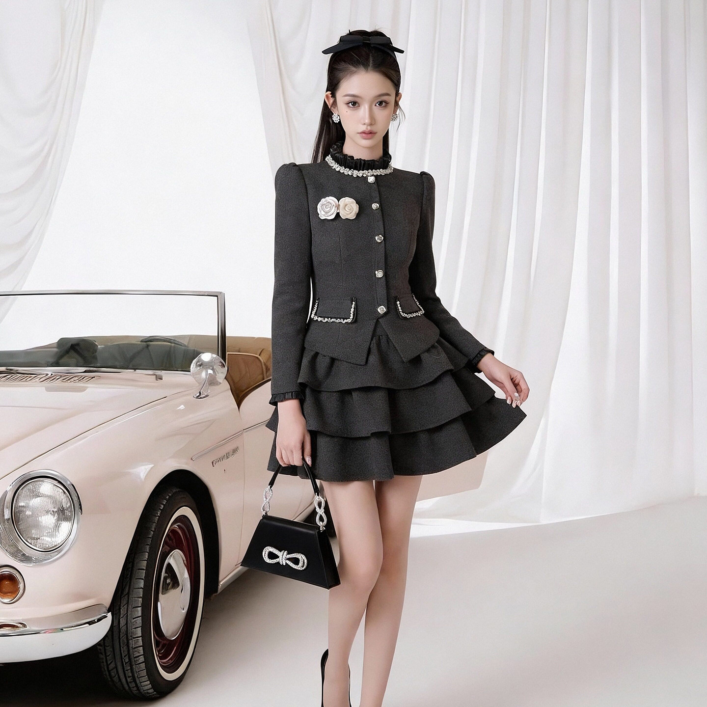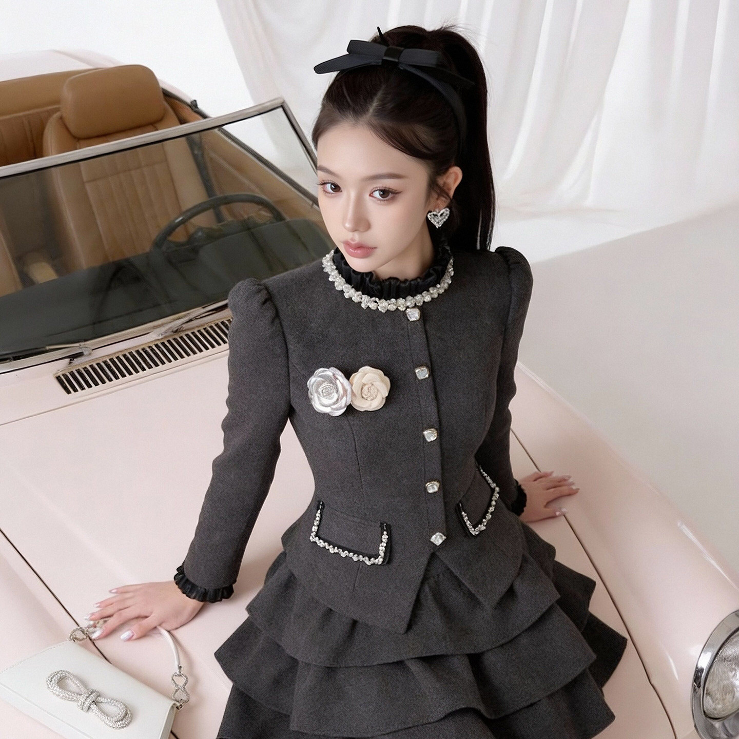 灰色西装连衣裙女气质礼服高端轻奢高级感小个子长袖蛋糕裙短裙子