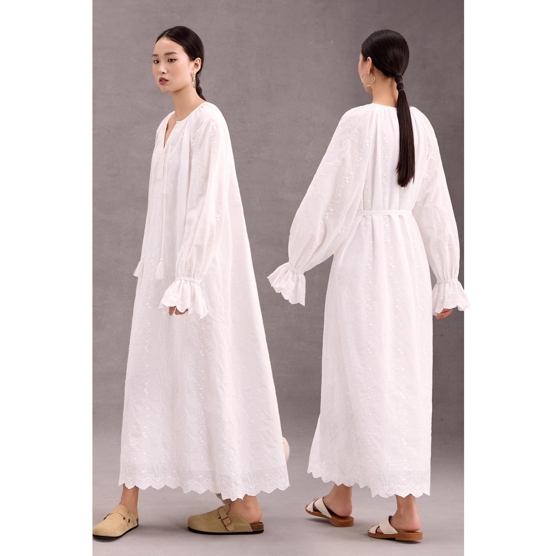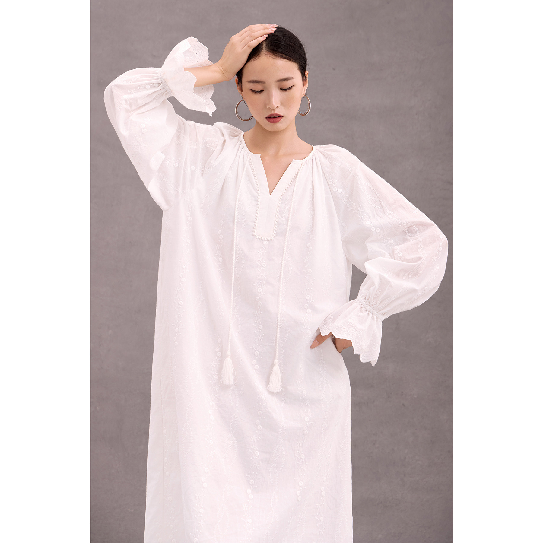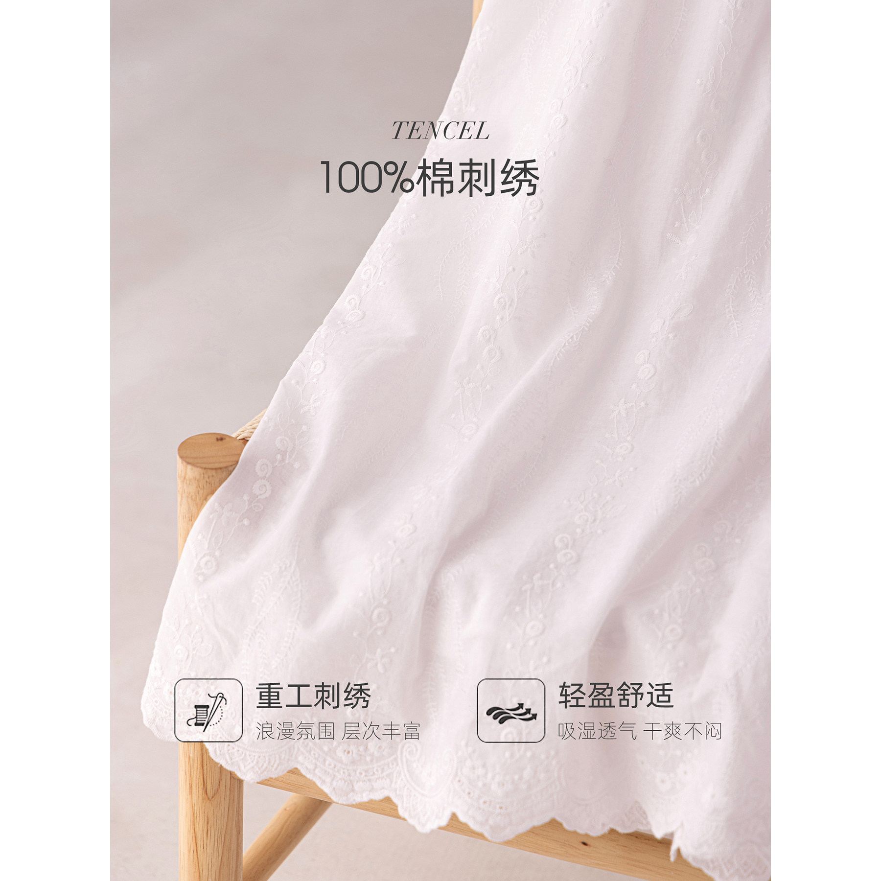 100%棉刺绣连衣裙子春秋新款度假风休闲宽松女装法式绣花长袖白色