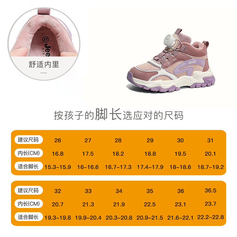 jeep女童鞋加绒运动鞋二棉鞋冬季男童棉鞋2026冬天款3-13岁防滑底
