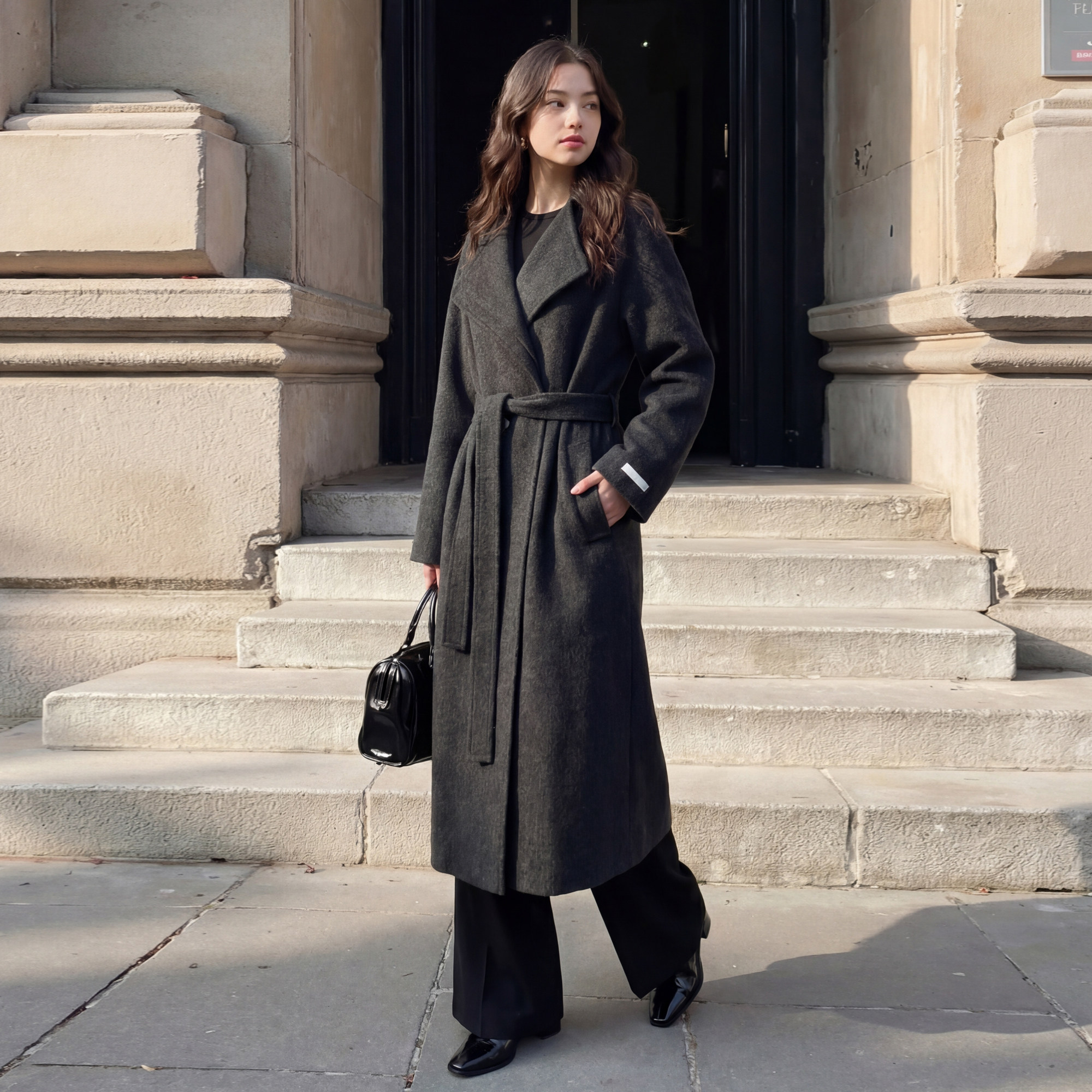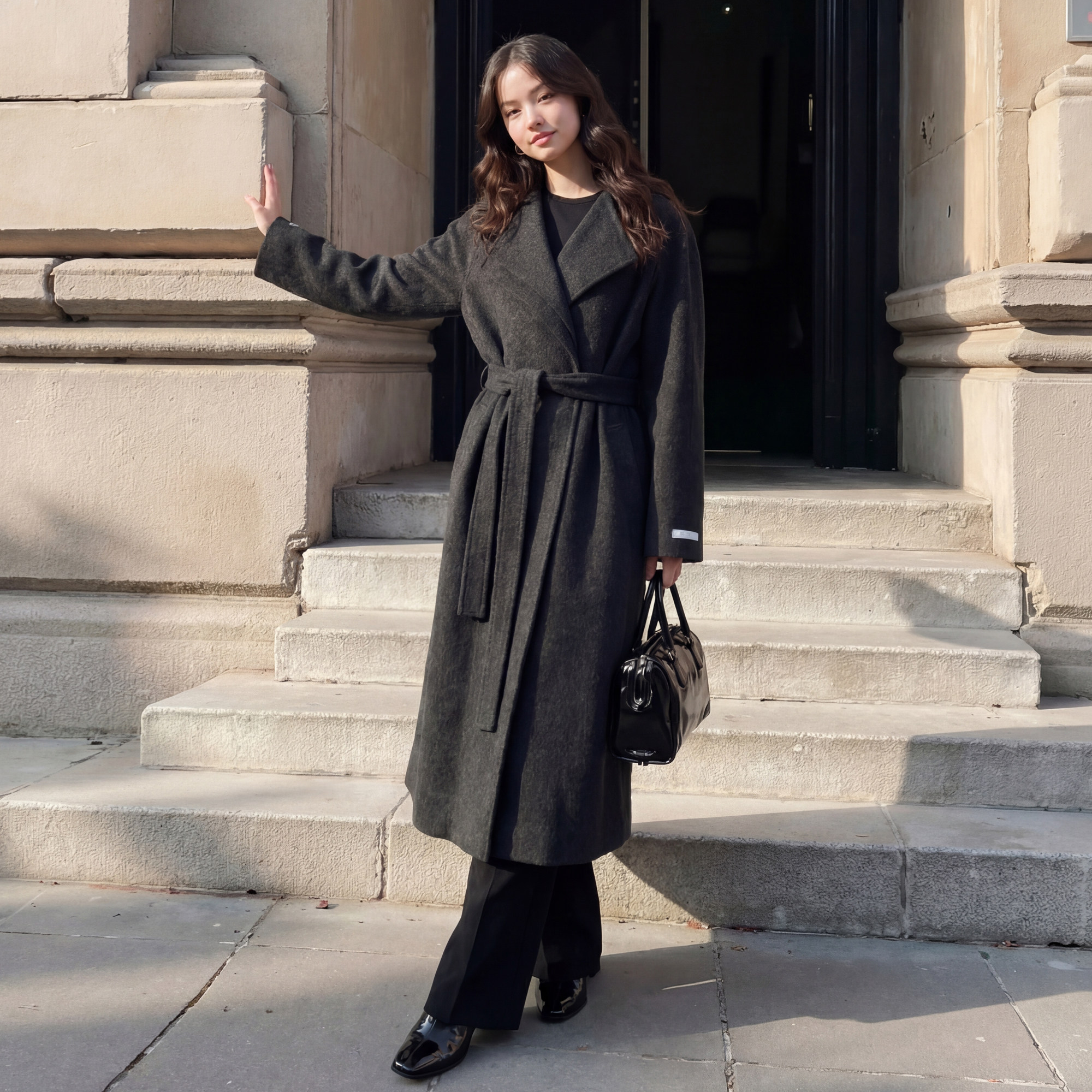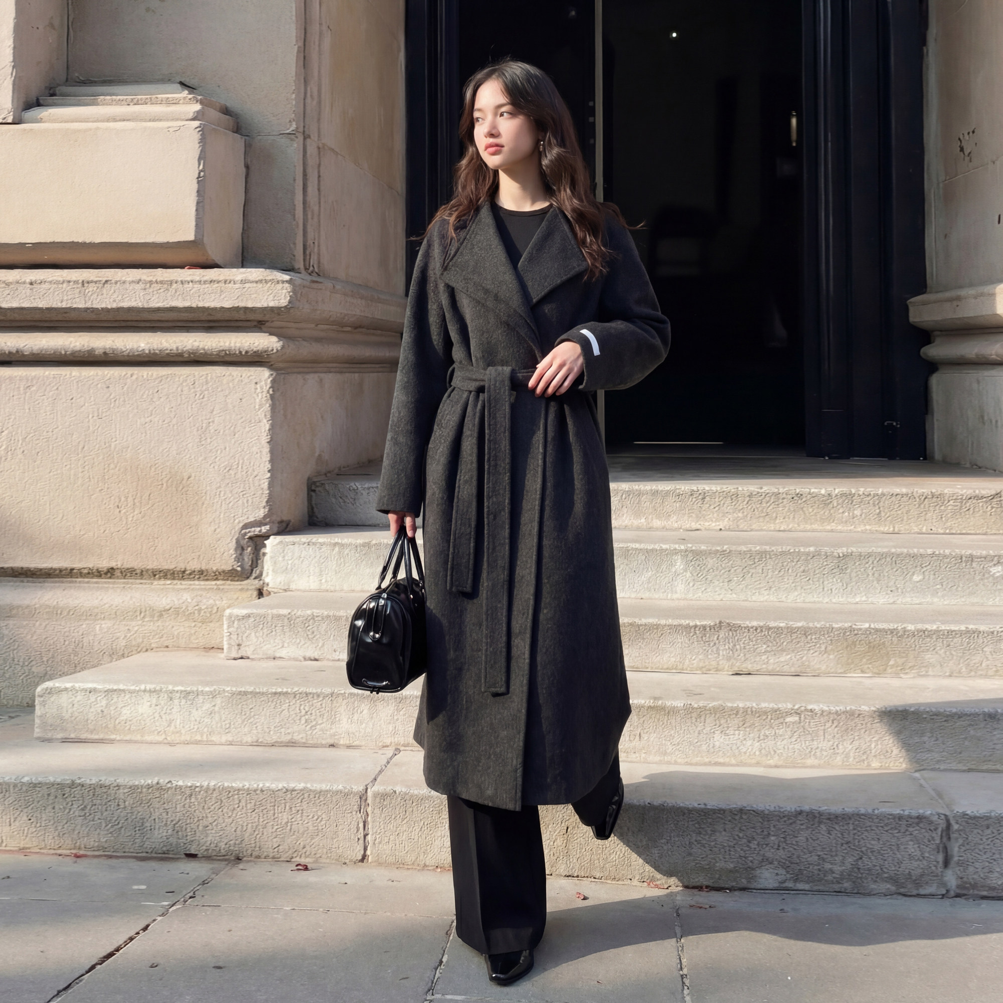 纯阅羊毛大衣女款2025新款中长翻领系带毛呢高级感气质冬季厚外套