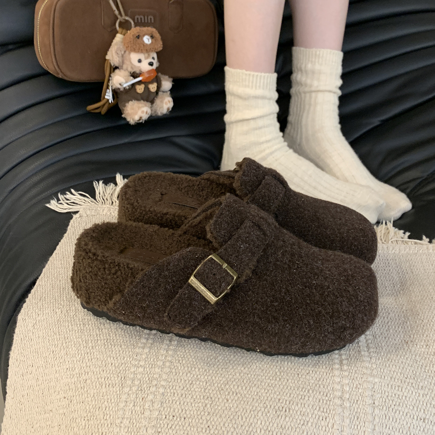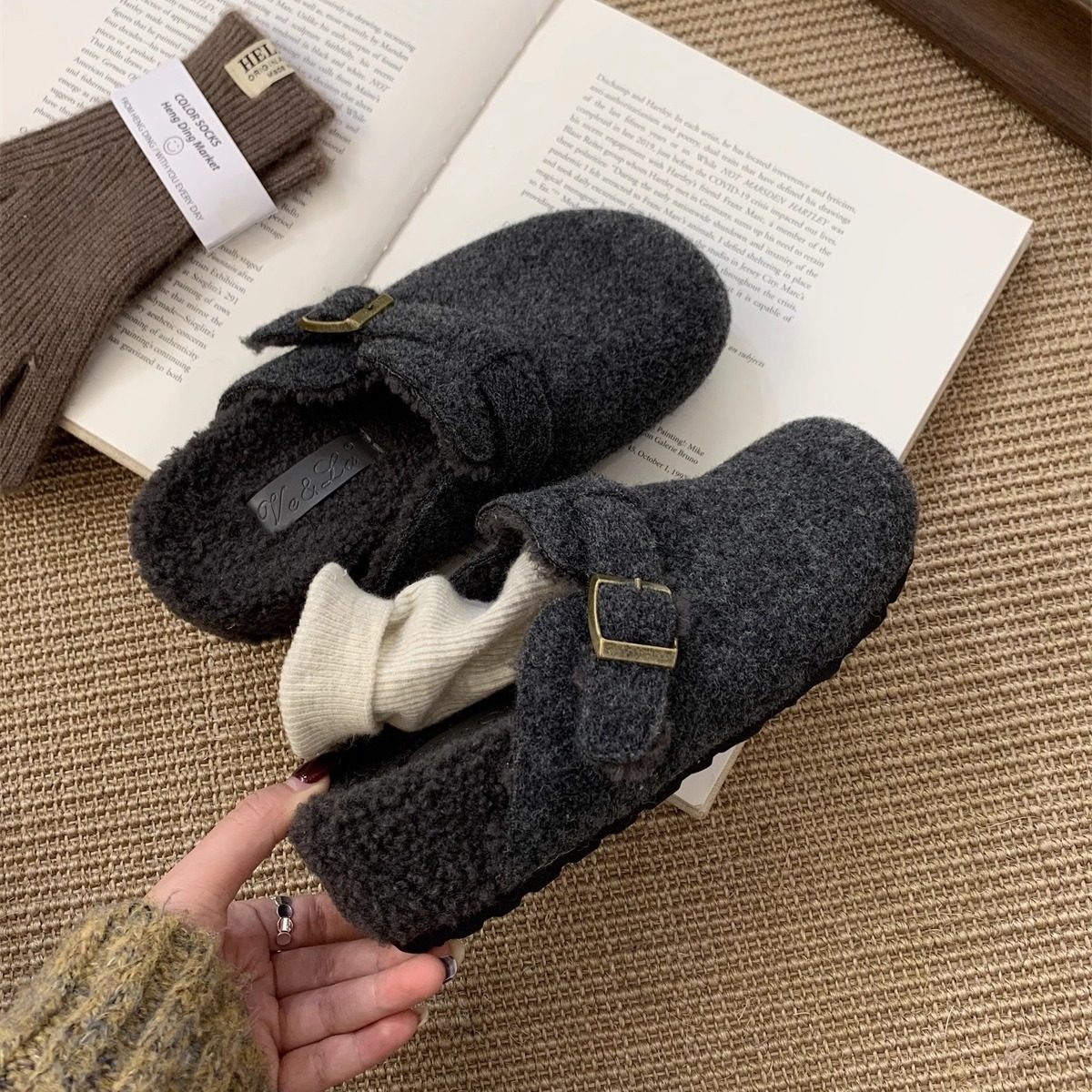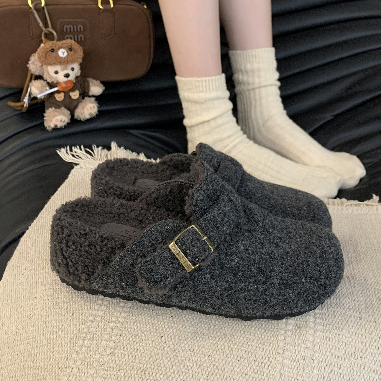 内增高5CM~灰色毛毛鞋女冬外穿新款厚底勃肯鞋女加绒包头半拖棉鞋