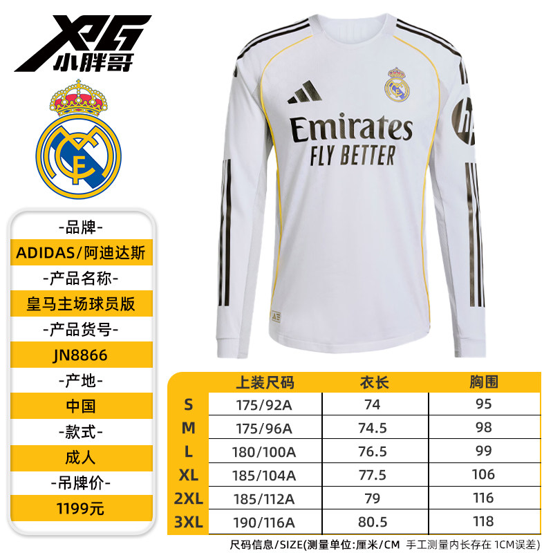 小胖哥XPG阿迪达斯25-26皇马球员版主场长袖球衣比赛训练足球服男