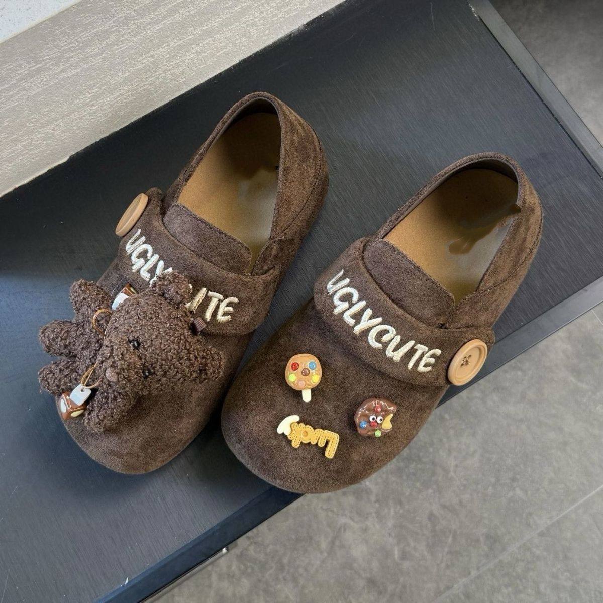 卡通毛绒小熊儿童勃肯鞋2026春秋新款女童复古皮鞋两穿半拖鞋大童