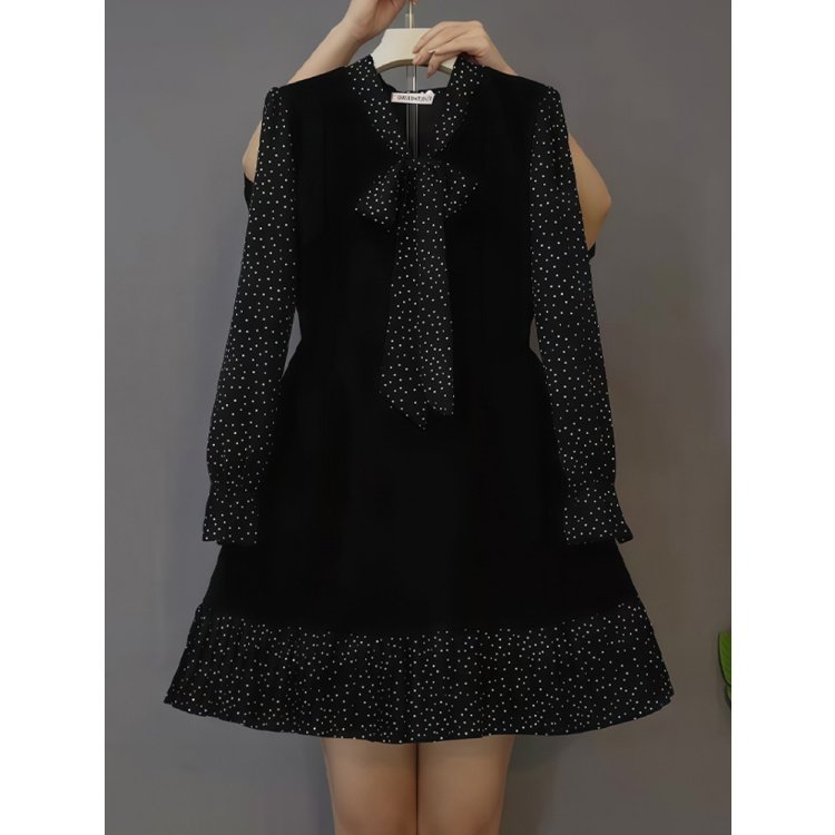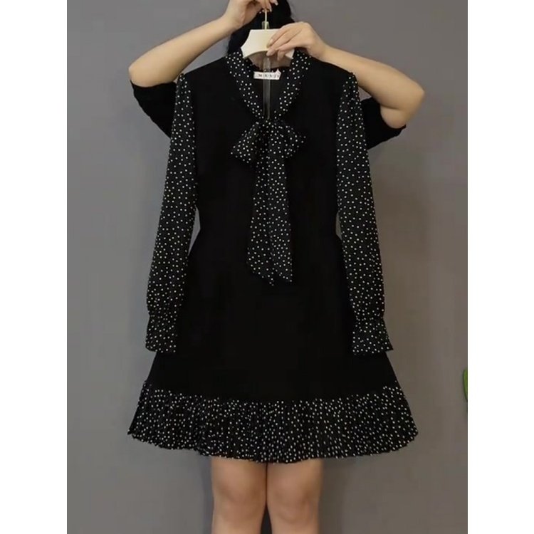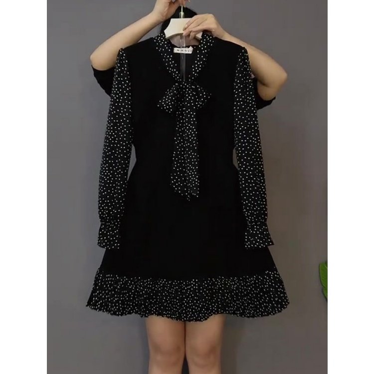 法式复古风黑色波点短款连衣裙女春季新款胖mm遮肉大码显瘦短裙子