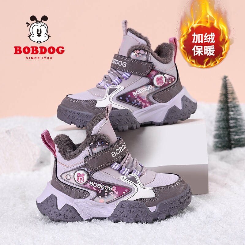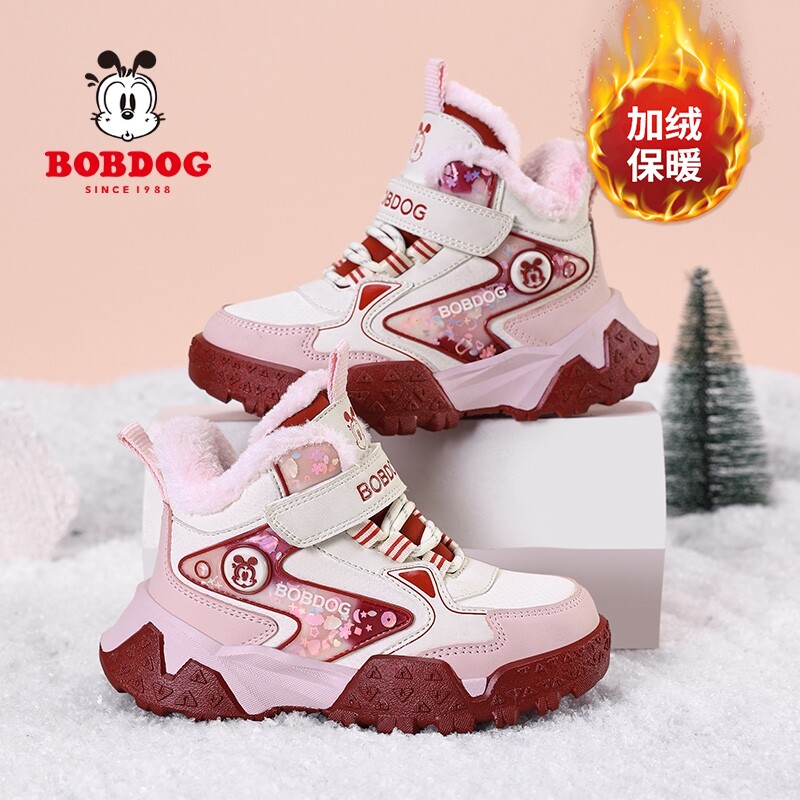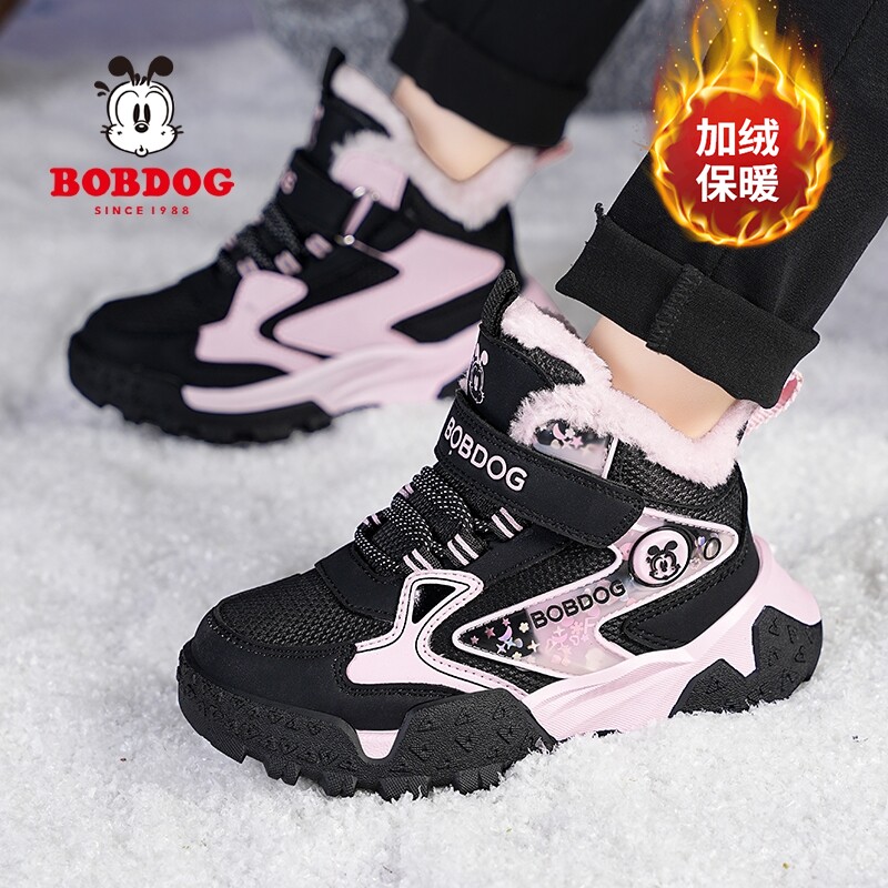 巴布豆女童雪地靴冬季皮面防水加绒加厚保暖儿童运动鞋女孩大棉鞋