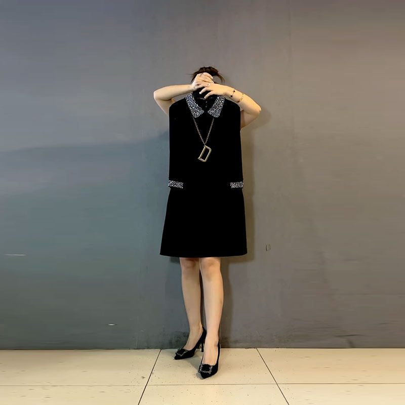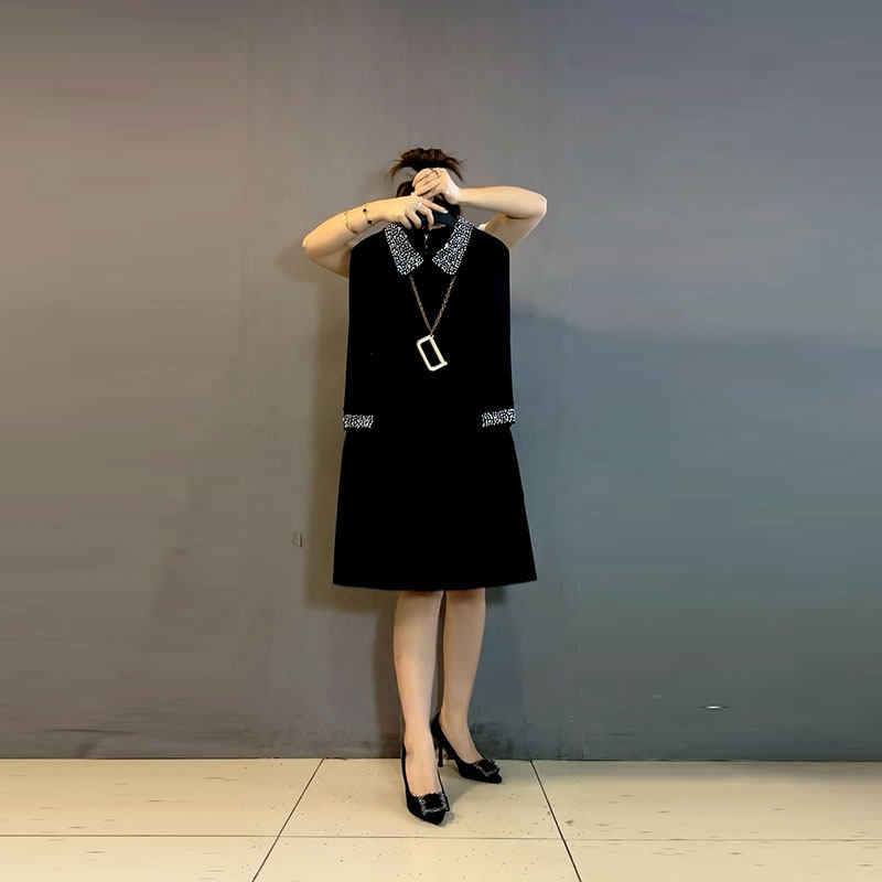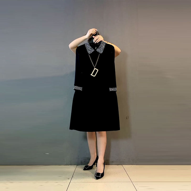 大码女装翻领拼接烫钻长袖气质轻熟风黑色中长款巨显瘦胖MM连衣裙