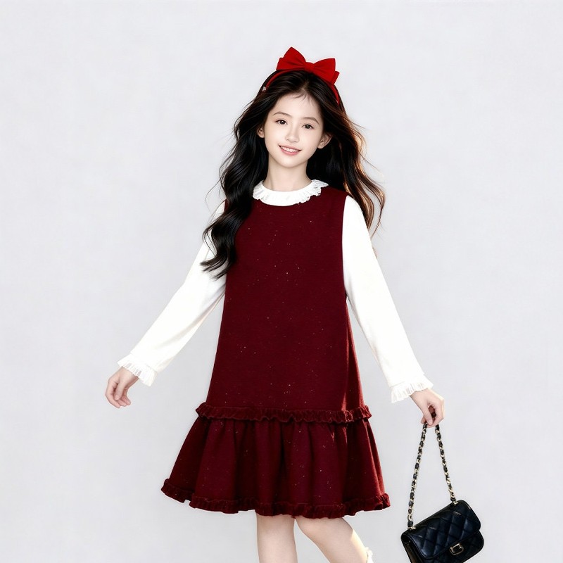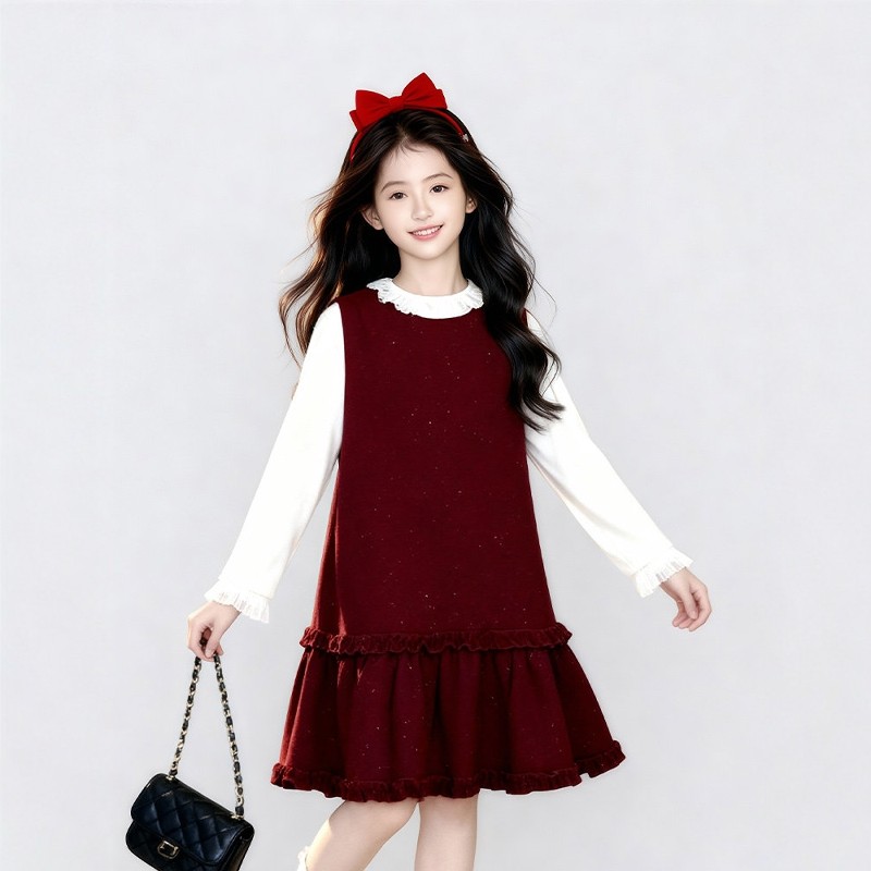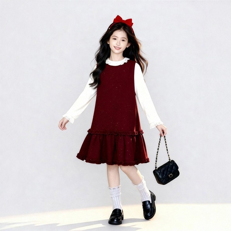 日本JGYP2026新款女童春秋连衣裙圆领时尚红色高级感洋气裙两件套
