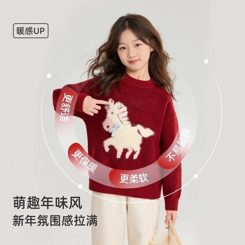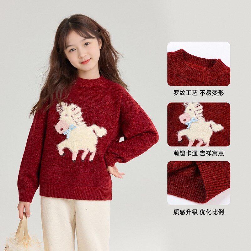 女童红色马年毛衣2026新款新年拜年服洋气小女孩套头针织打底衫潮