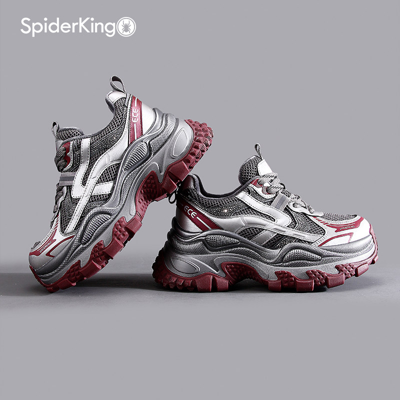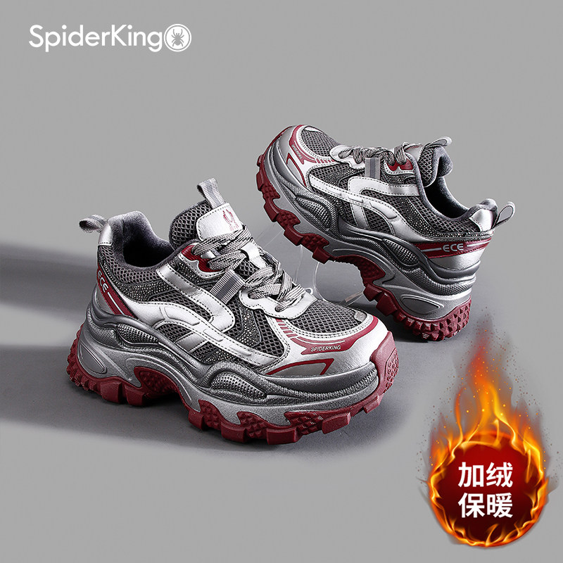 蜘蛛王加绒老爹鞋女2025冬季网面不闷脚增高休闲运动鞋厚底增高鞋