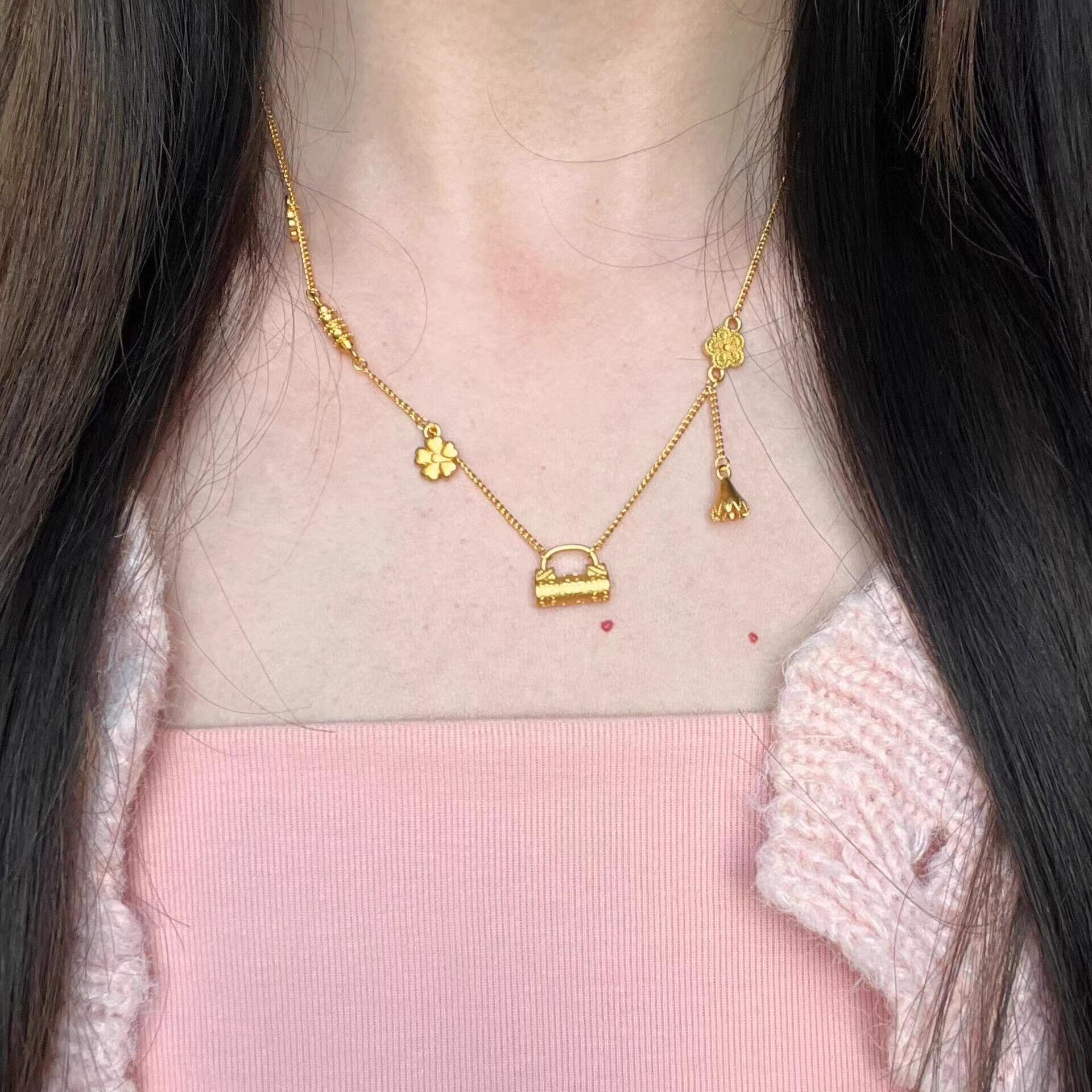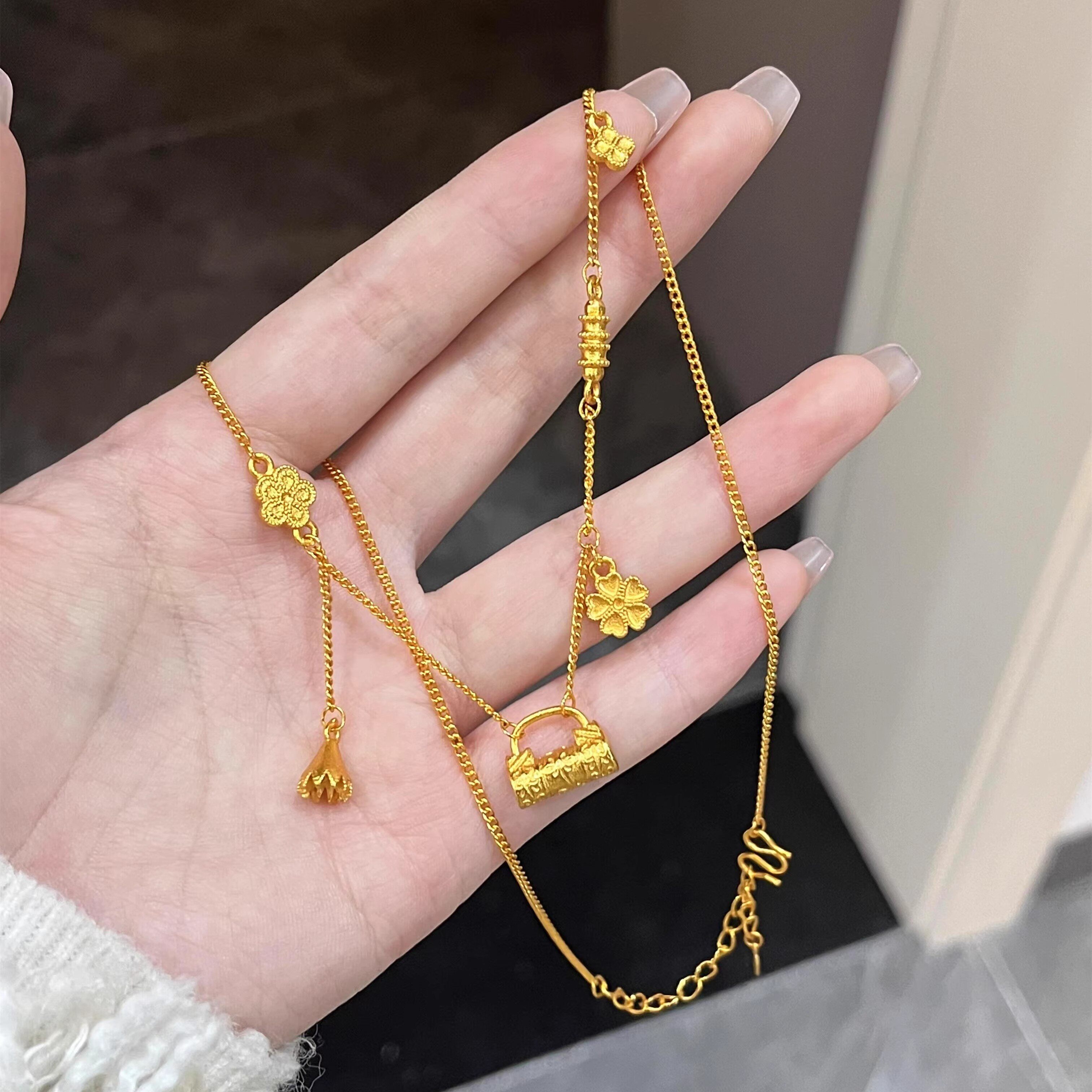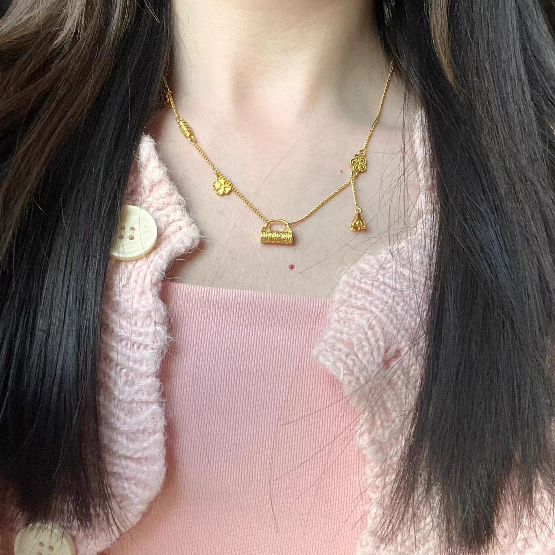 2025新款仿黄金色锁包繁花项链女毛衣链高级感轻奢小众气质锁骨链