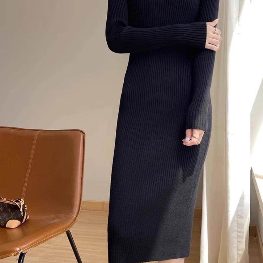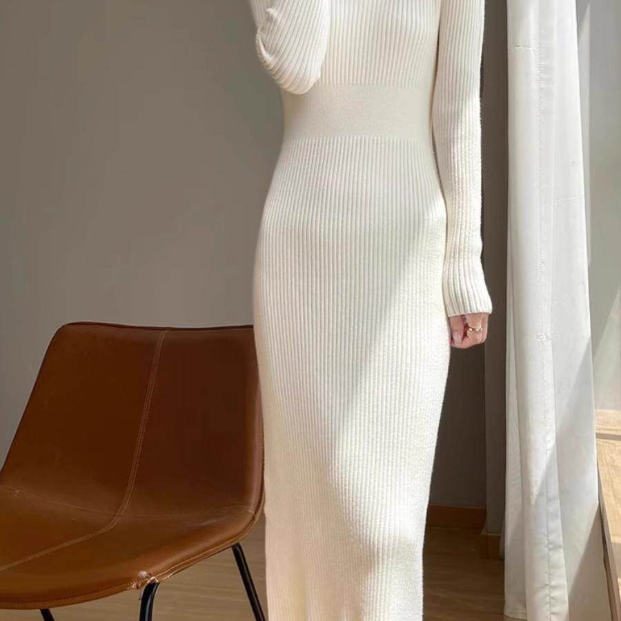冬季针织连衣裙修身显瘦U领毛衣长裙配大衣马甲打底裙中长款裙子