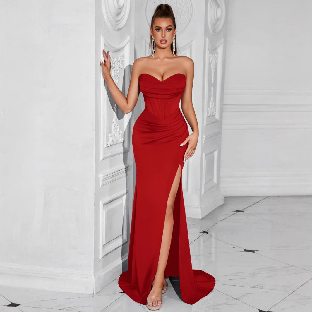 时尚女装跨境新款晚礼服大摆裙抹胸性感长款纯色连衣裙dress