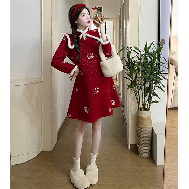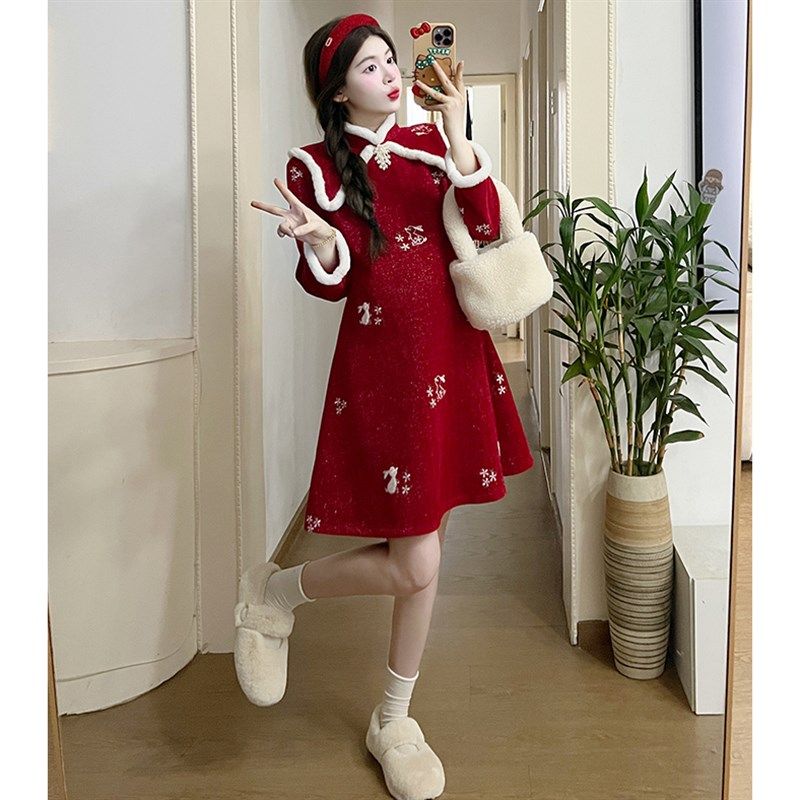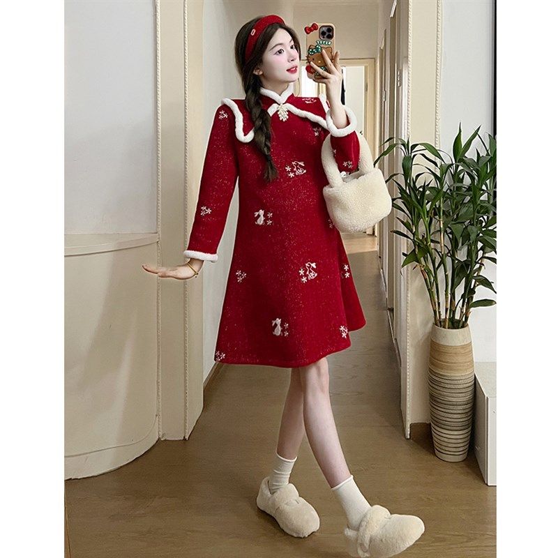 孕妇连衣裙秋冬2024新款过年红色旗袍中式加绒加厚小个子中长款女