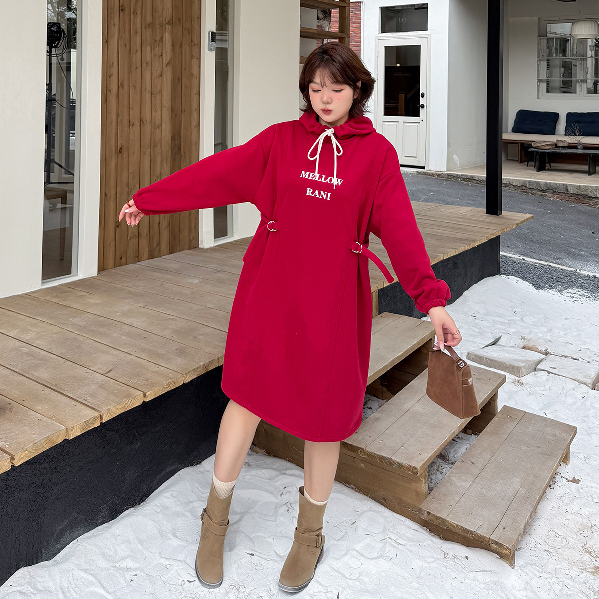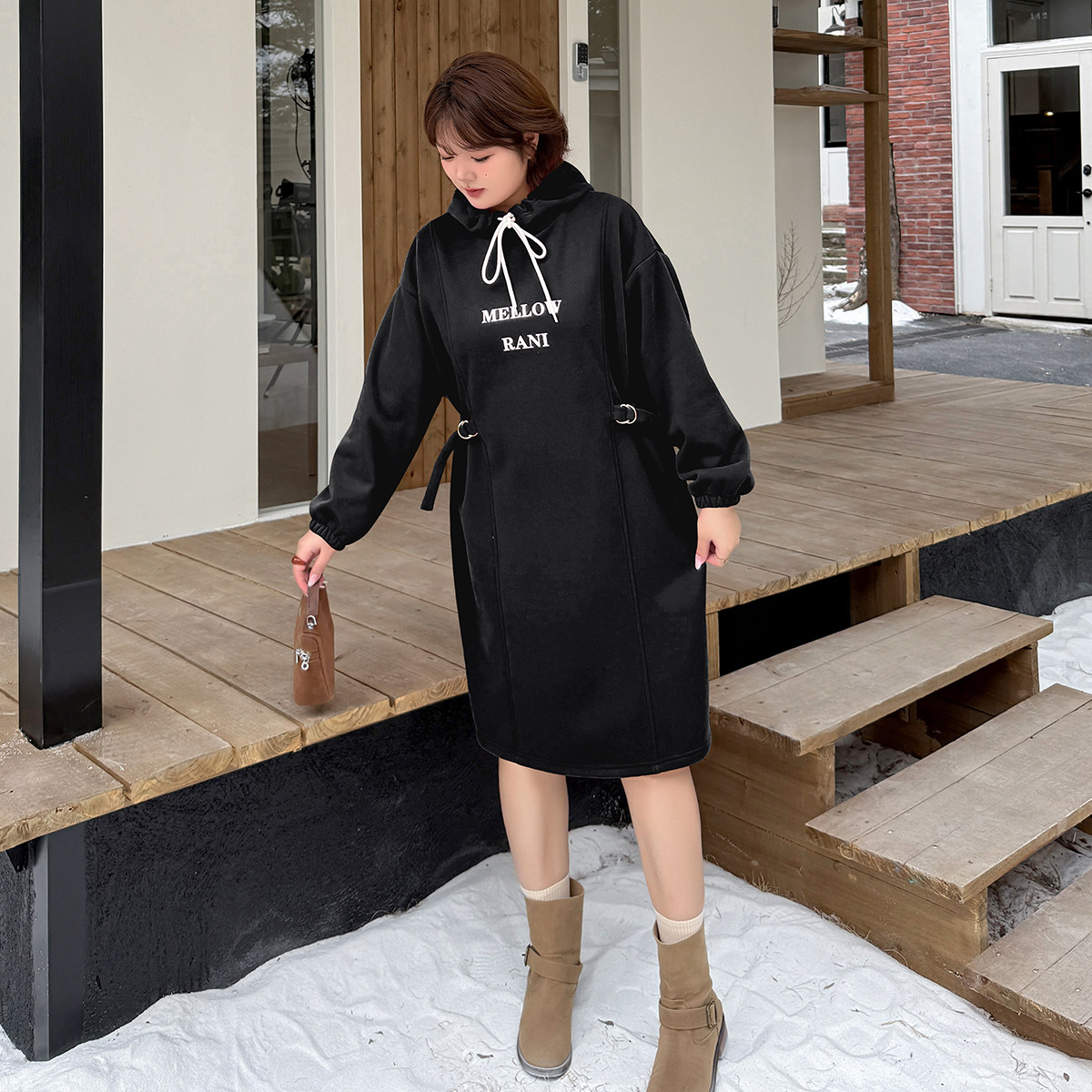 大码韩版中长款休闲连帽卫衣裙2025秋冬新款加绒加厚小个子连衣裙