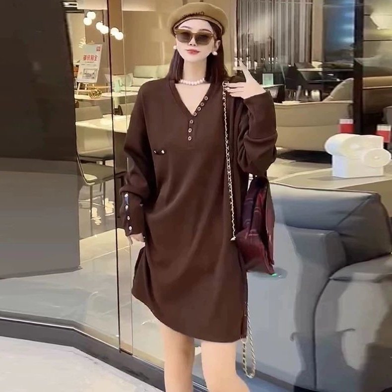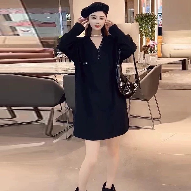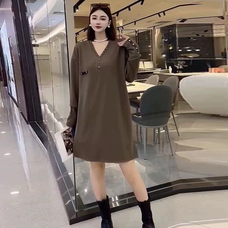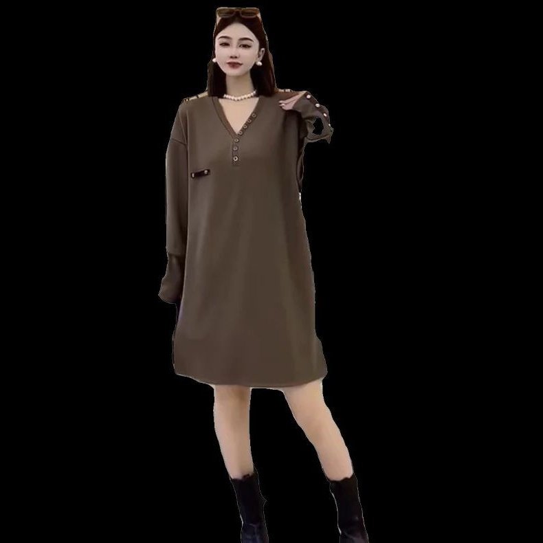美式潮流时髦洋气秋冬款女装中长款胖MM2-300斤超大码V领连衣裙潮