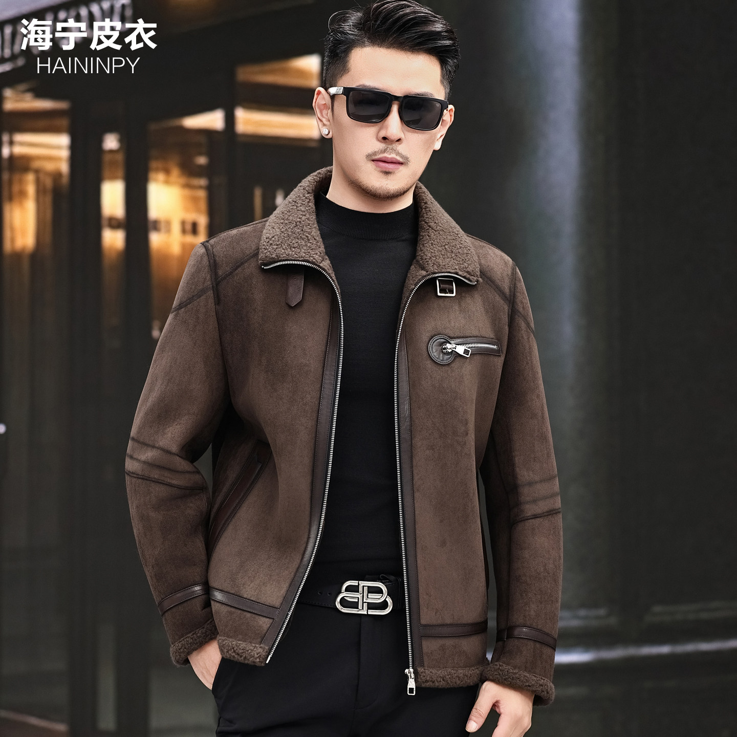 头层皮海宁真皮皮衣男皮毛一体加绒加厚爸爸装皮夹克男羊羔毛外套