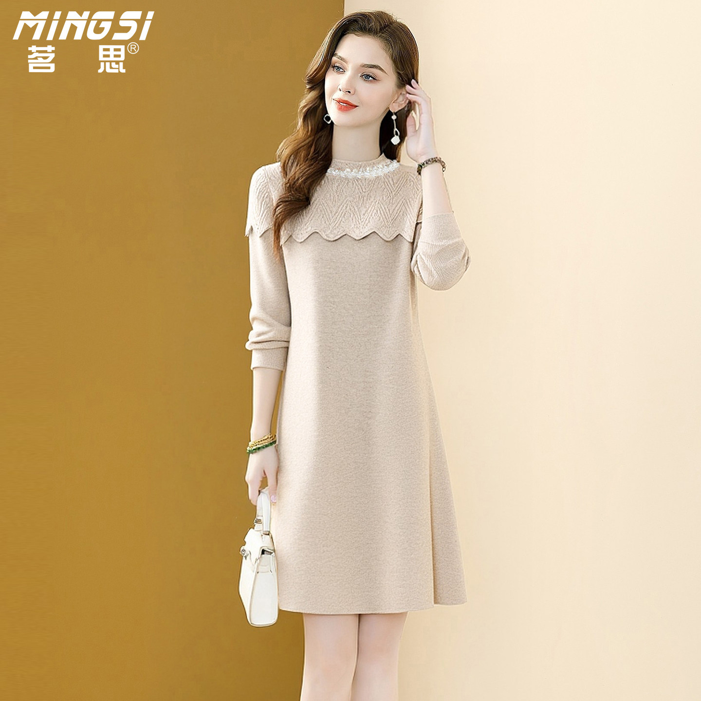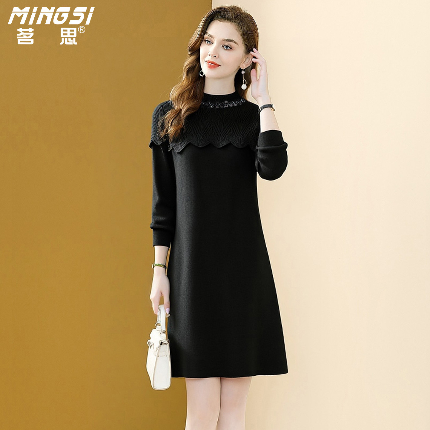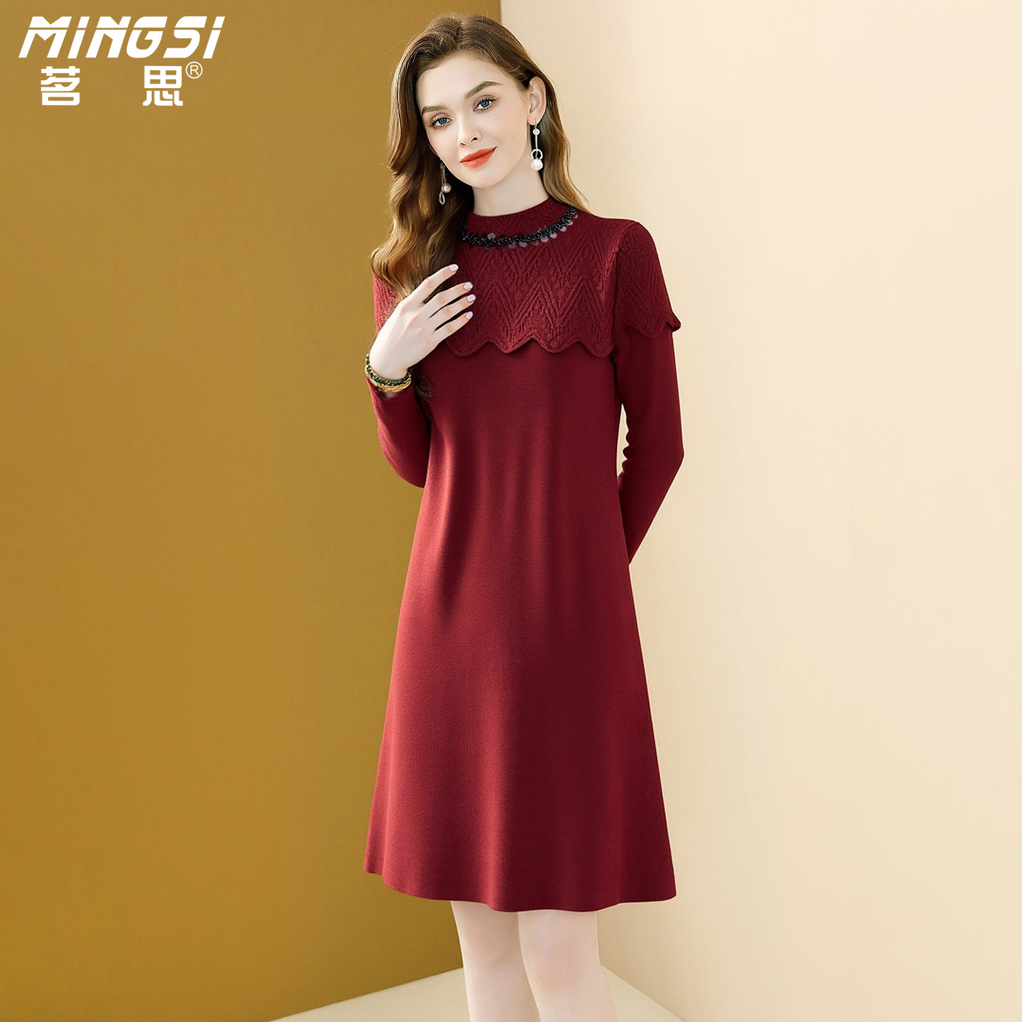 茗思红色气质针织连衣裙女2025秋冬新款小个子亮片减龄显瘦毛衣裙