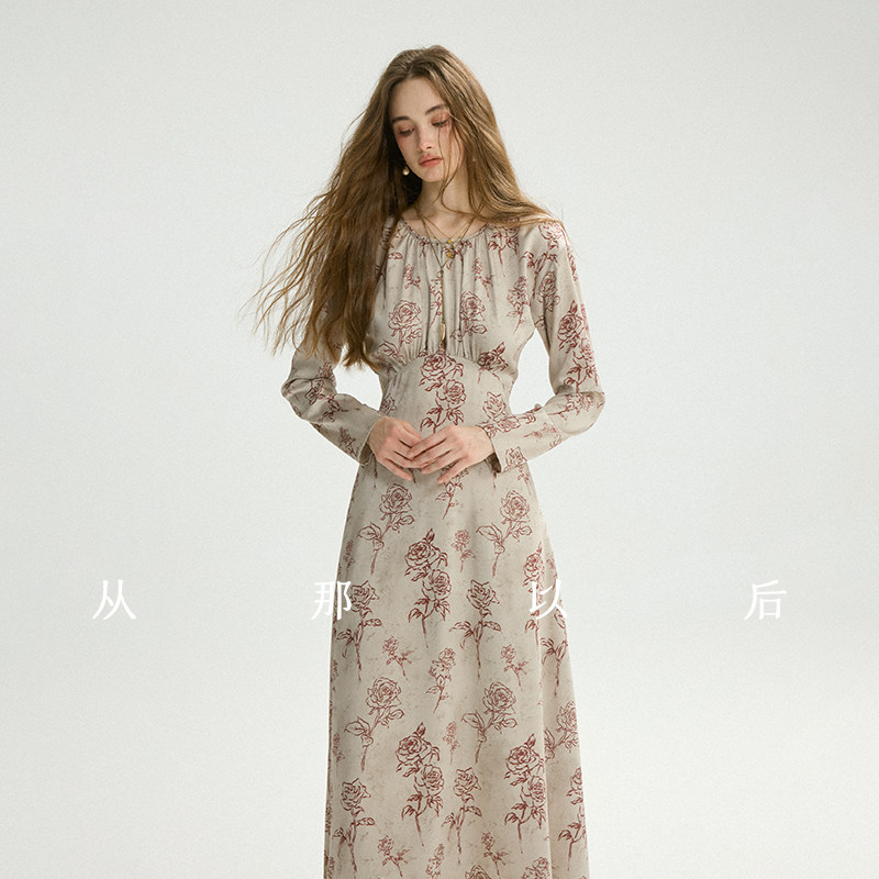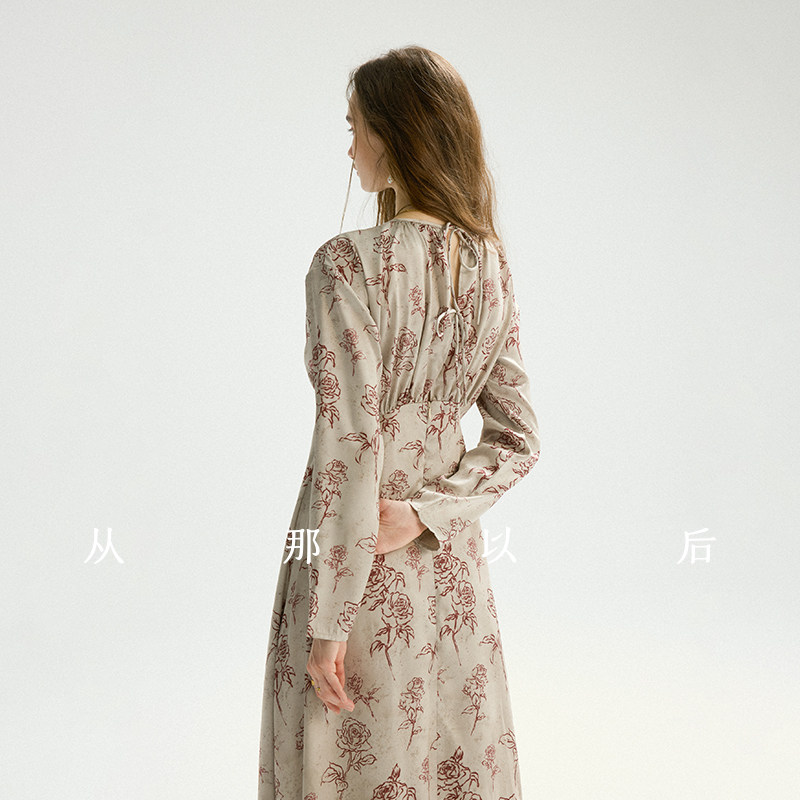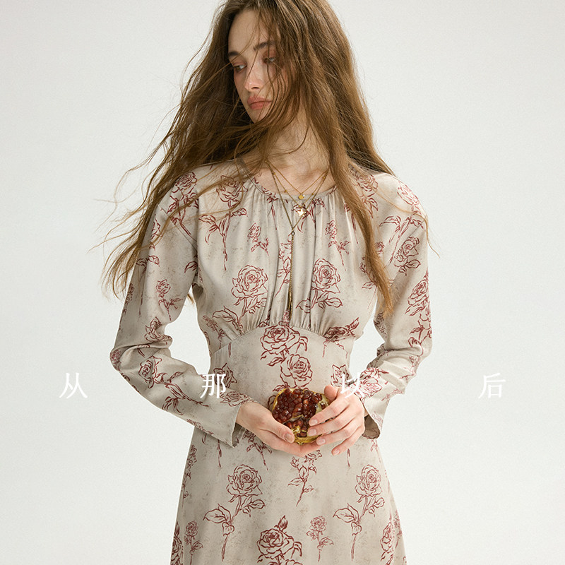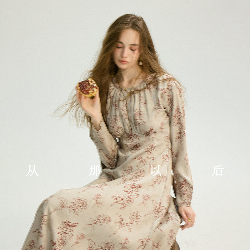从那以后法式碎花裙长袖连衣裙长款灰色裙子高级感绸缎长裙女春季