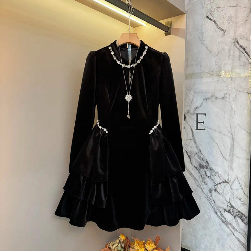 加肥亮钻领长袖收腰连衣裙大码女装中长款显瘦赫本风巨显瘦小黑裙