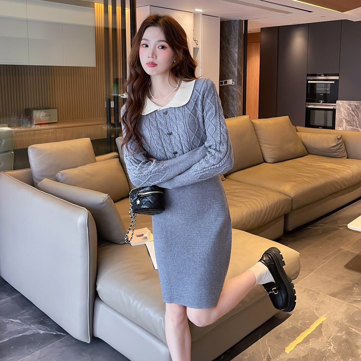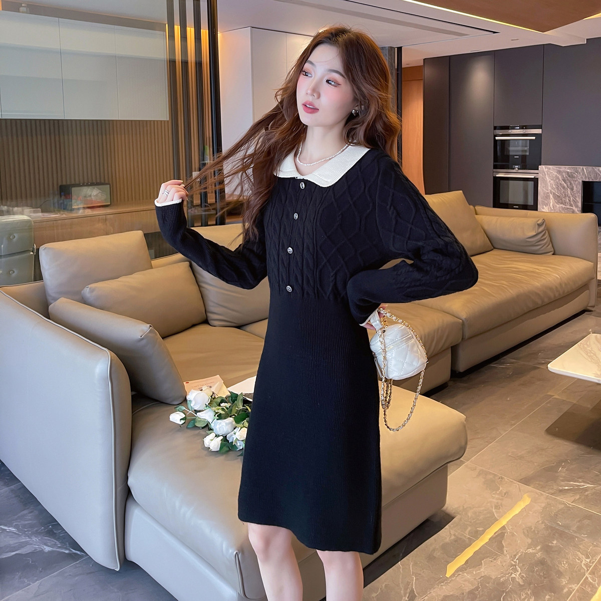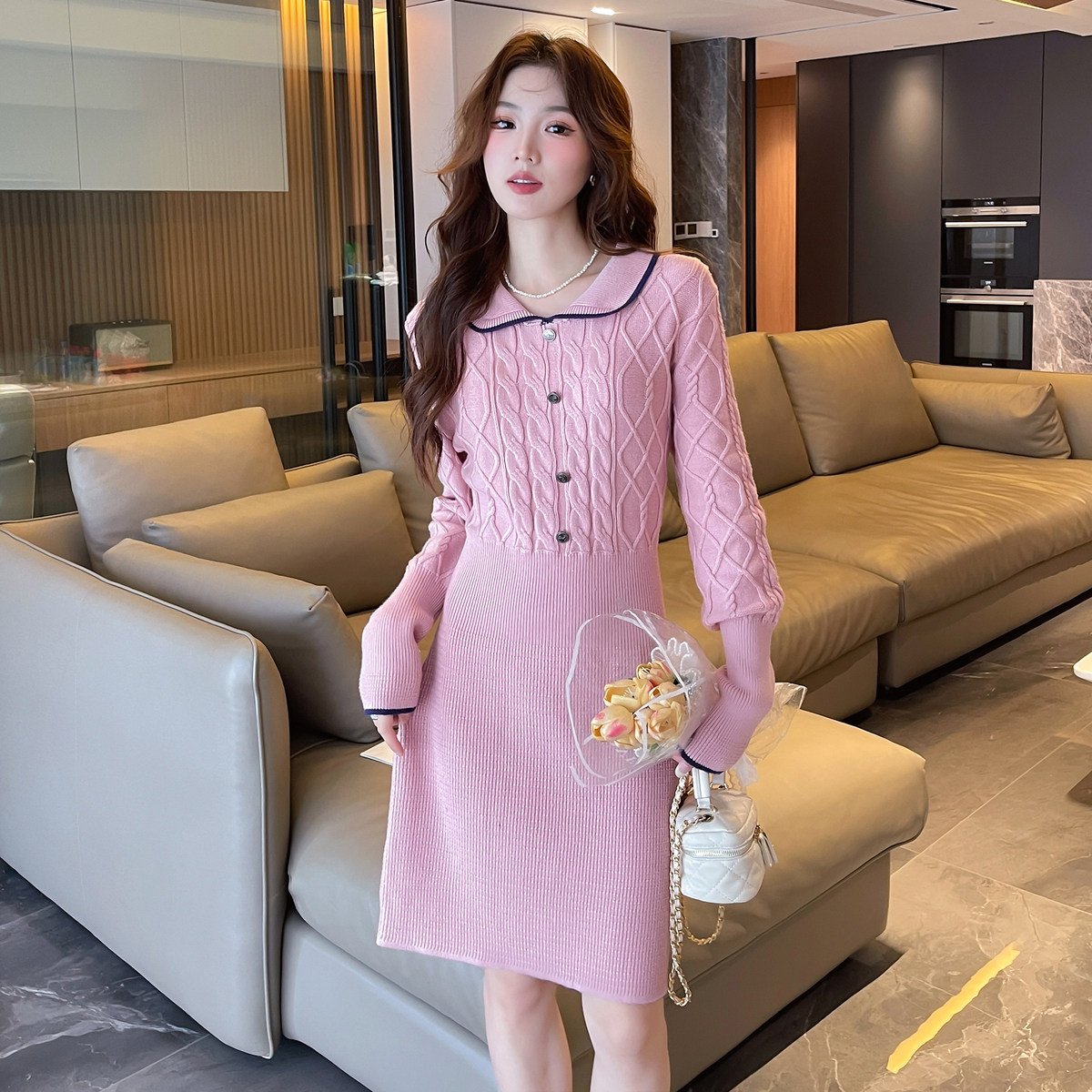 唐狮翻领收腰长袖毛衣连衣裙秋冬粉色温柔针织毛衣裙小香风裙子p4