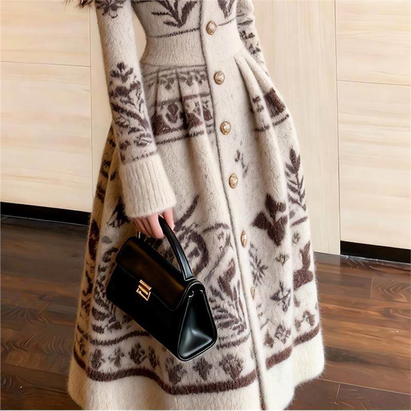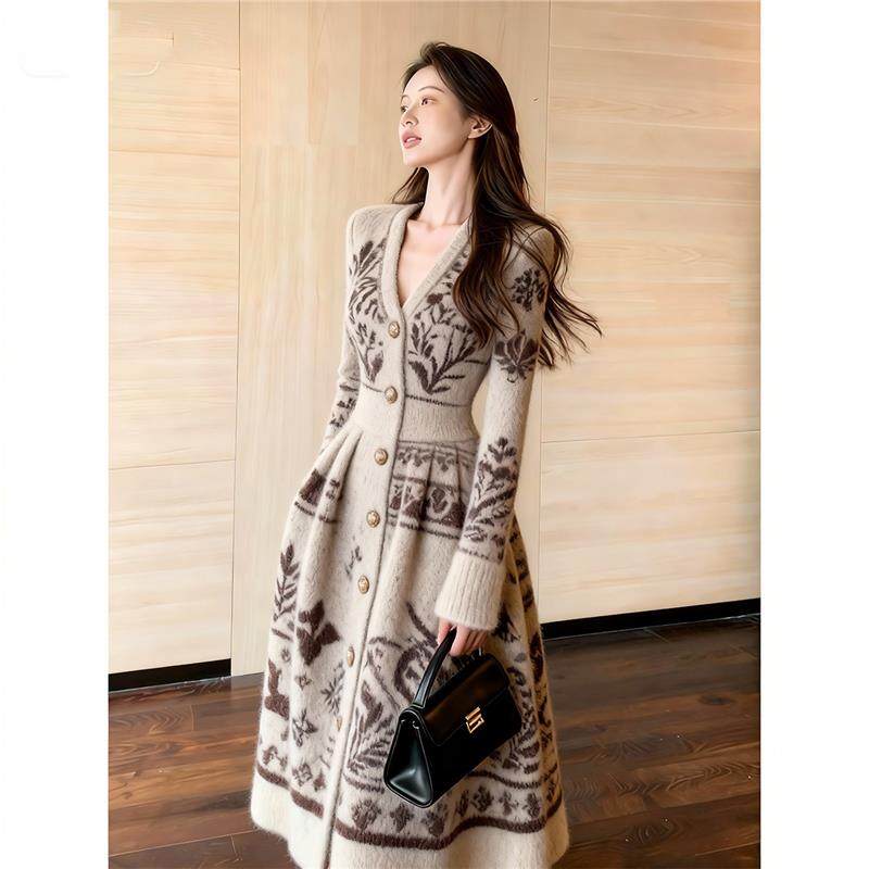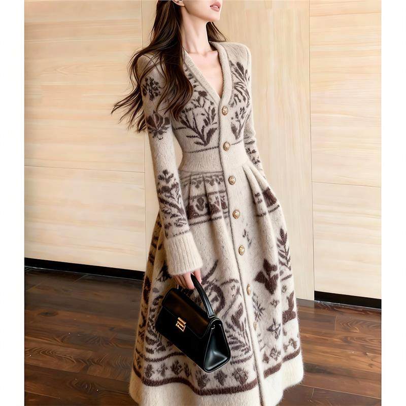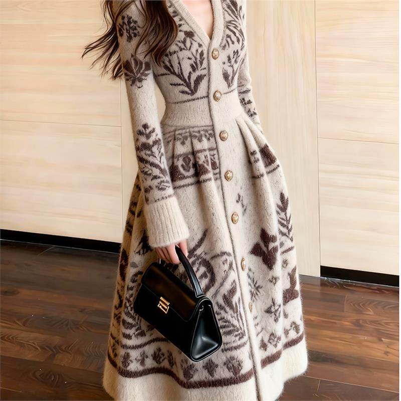 费尔岛提花针织连衣裙女长袖V领收腰中长款复古毛衣裙