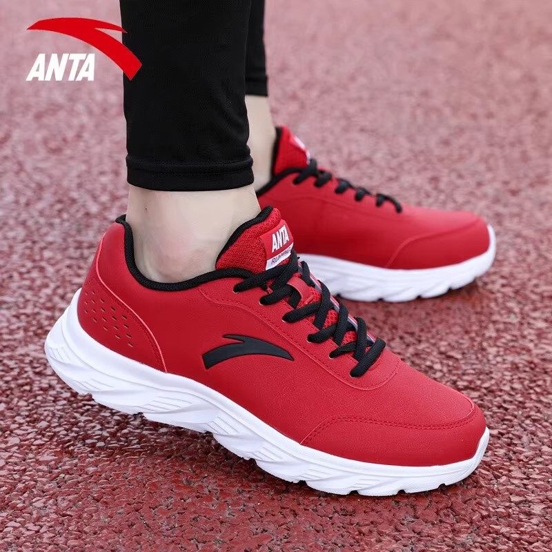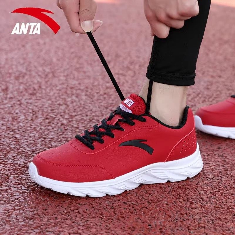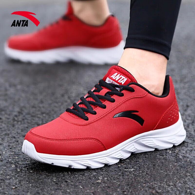 安踏男鞋皮面运动鞋官方正品旗舰冬季网面透气男士休闲红色跑步鞋