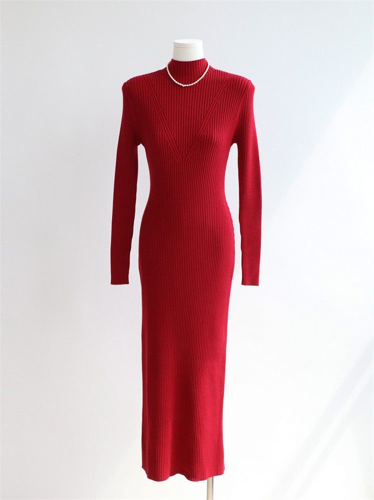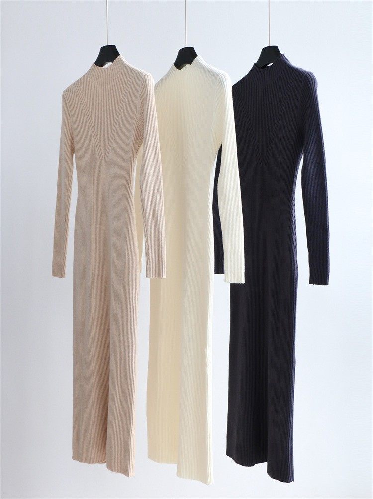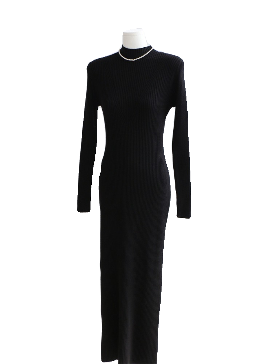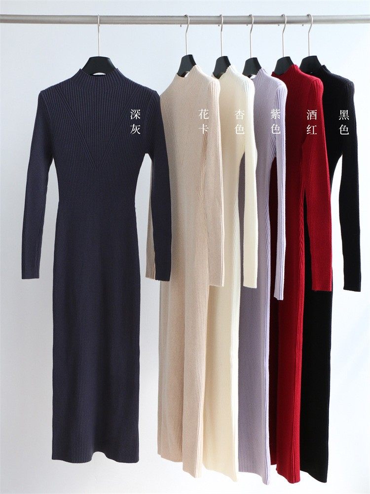 秋冬半高领修身针织连衣裙女长袖毛衣裙紧身内搭长款开叉连衣裙