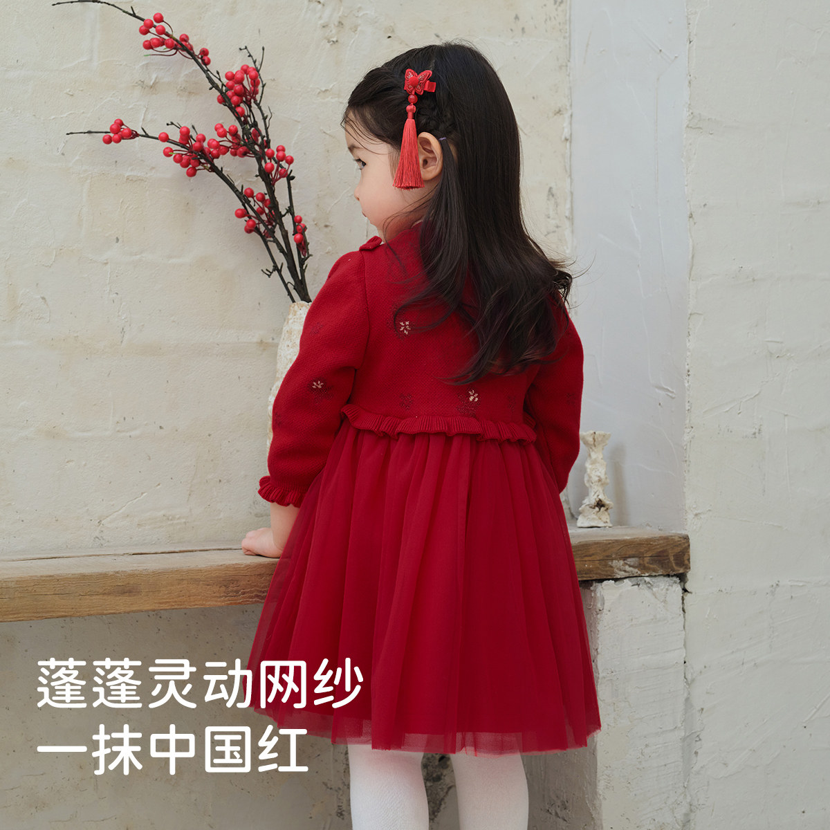 戴维贝拉女童毛衣连衣裙冬装2025新款儿童加绒裙宝宝国风新年裙子