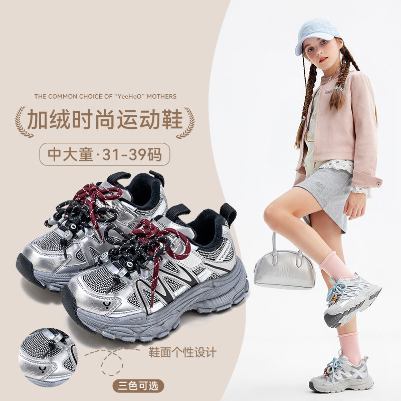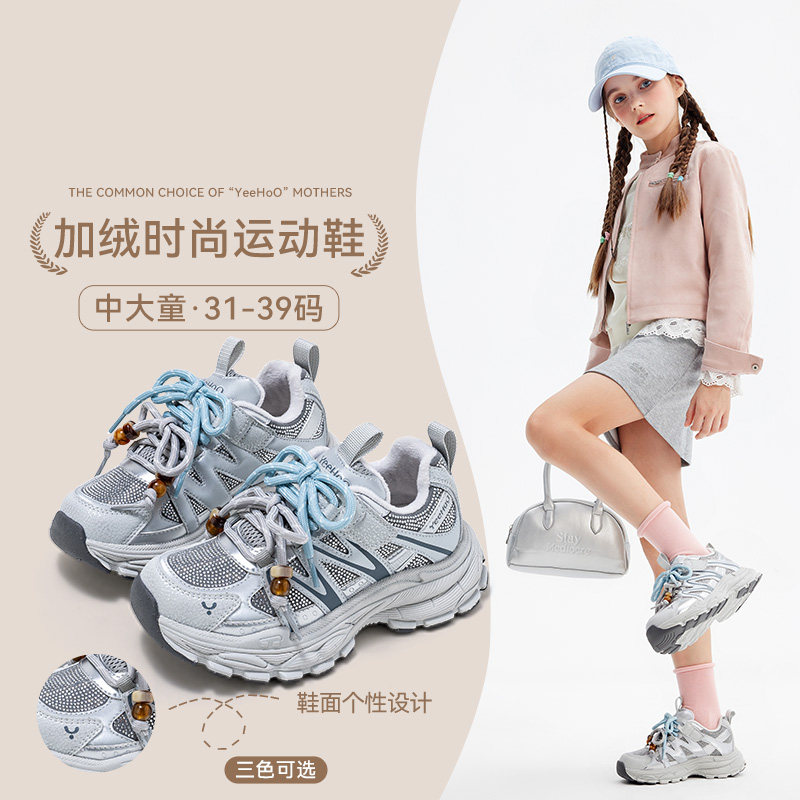 英氏老爹鞋女童冬天中大童鞋子保暖户外休闲百搭儿童加绒运动鞋