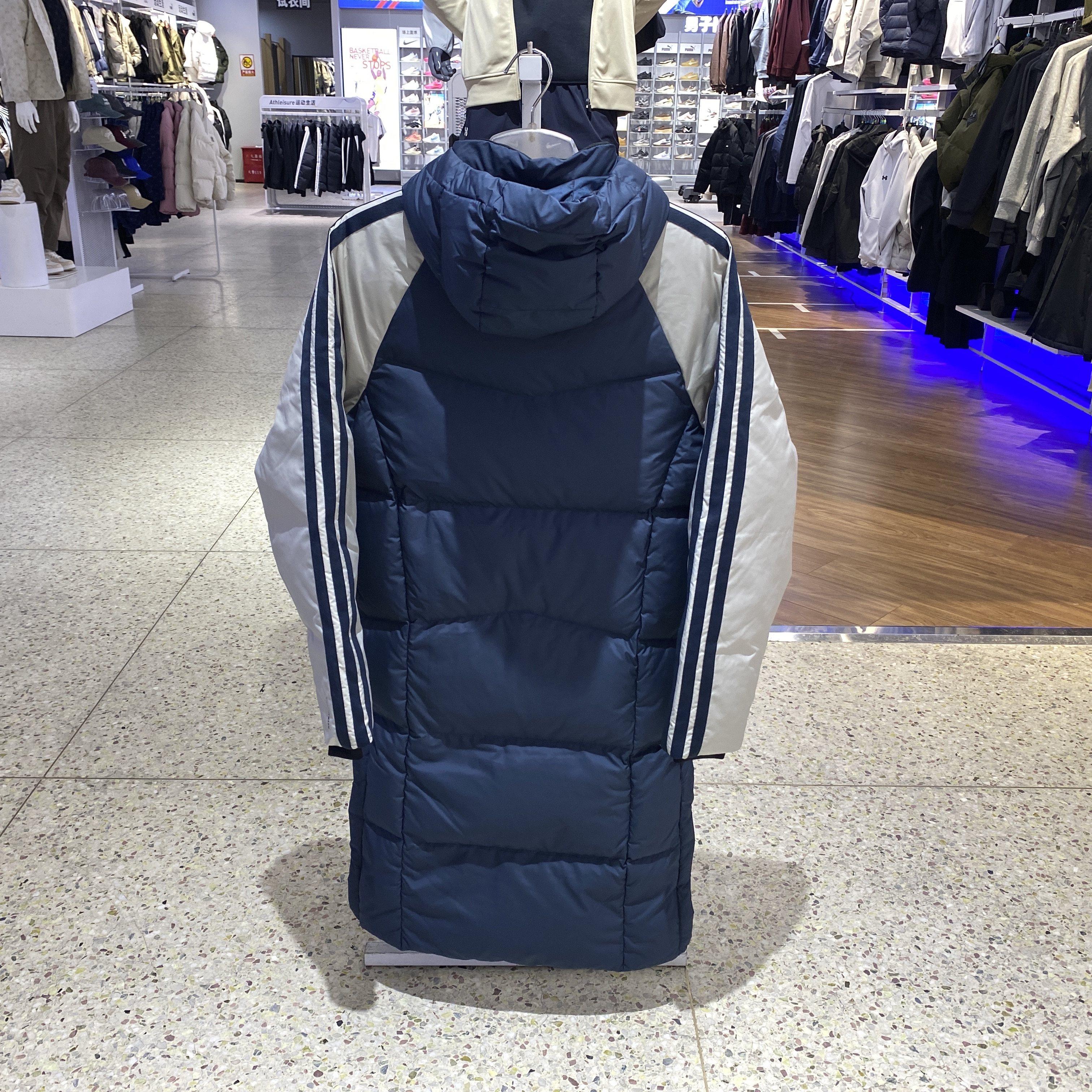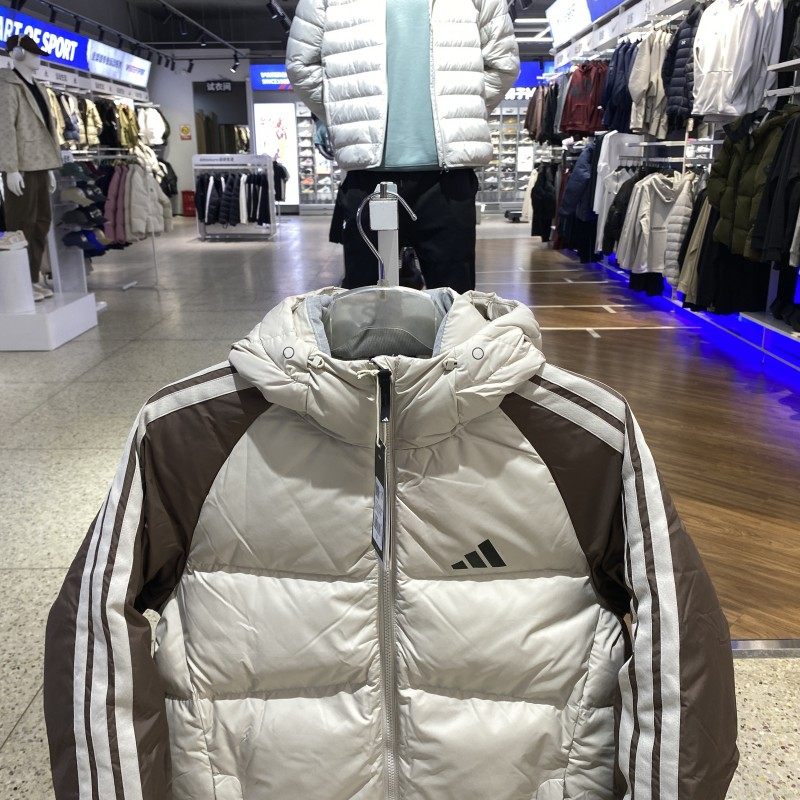 正品阿迪达斯ADIDAS男款三条纹拼色保暖连帽运动休闲羽绒服KQ5495