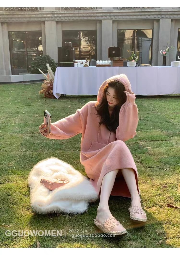 秋冬高级设计感配大衣连帽针织衫女中长款裙女内搭宽松毛衣连衣裙