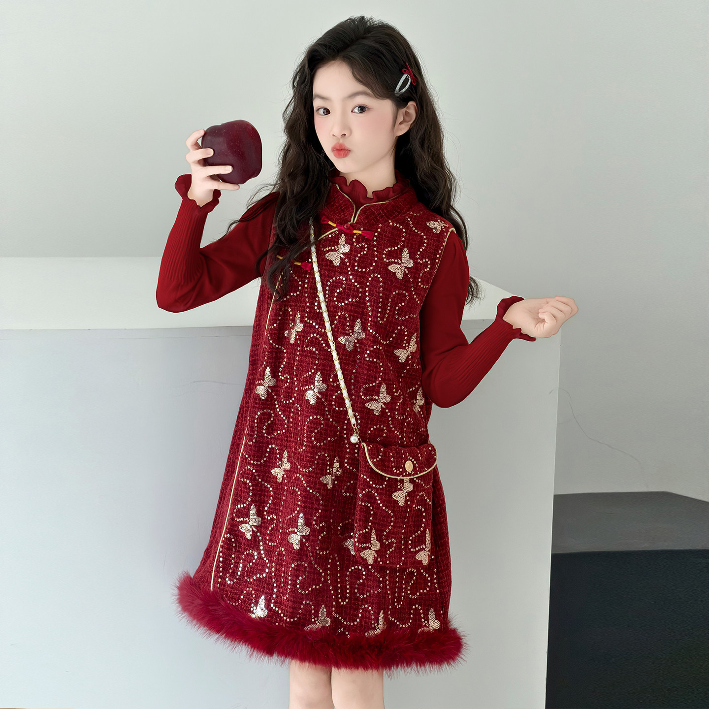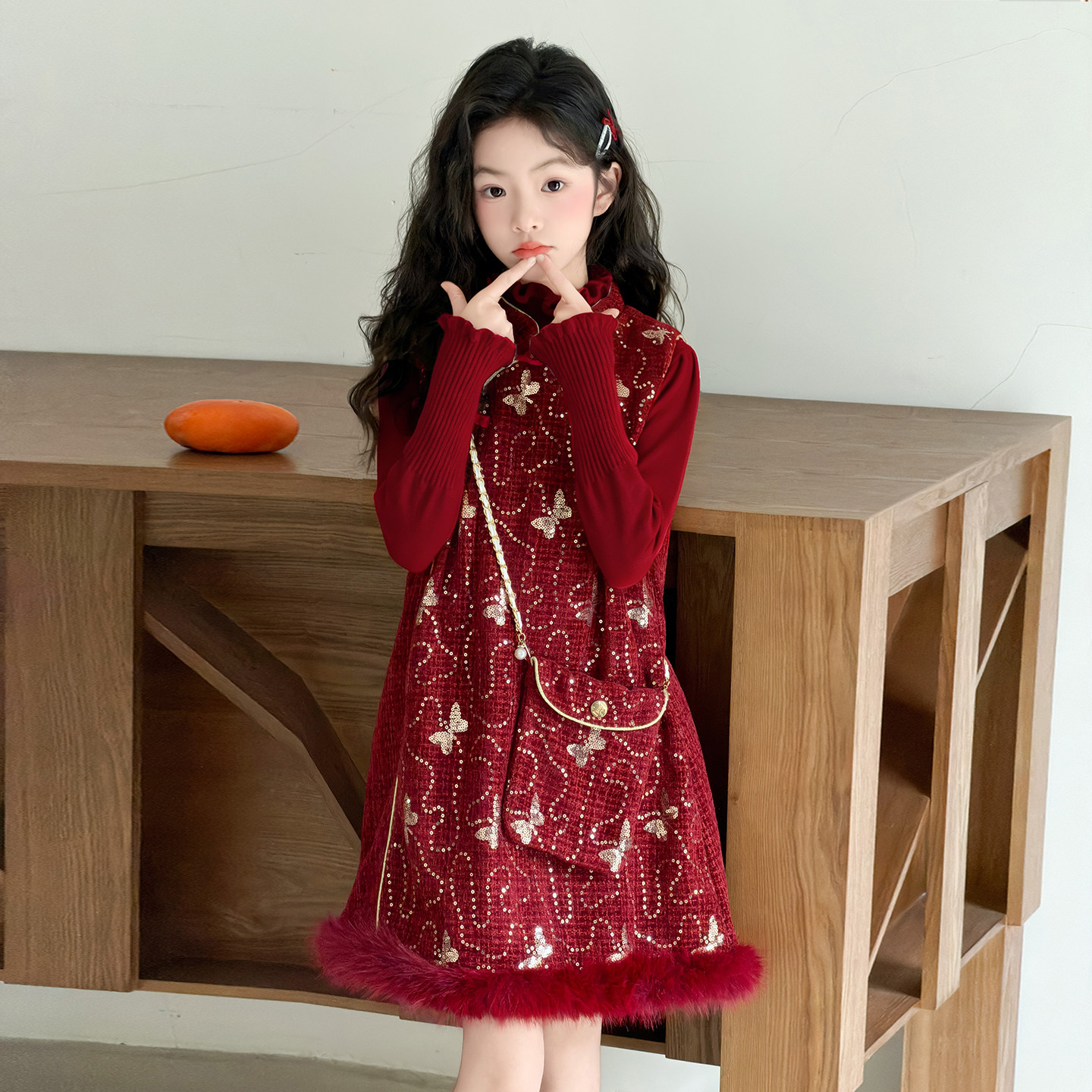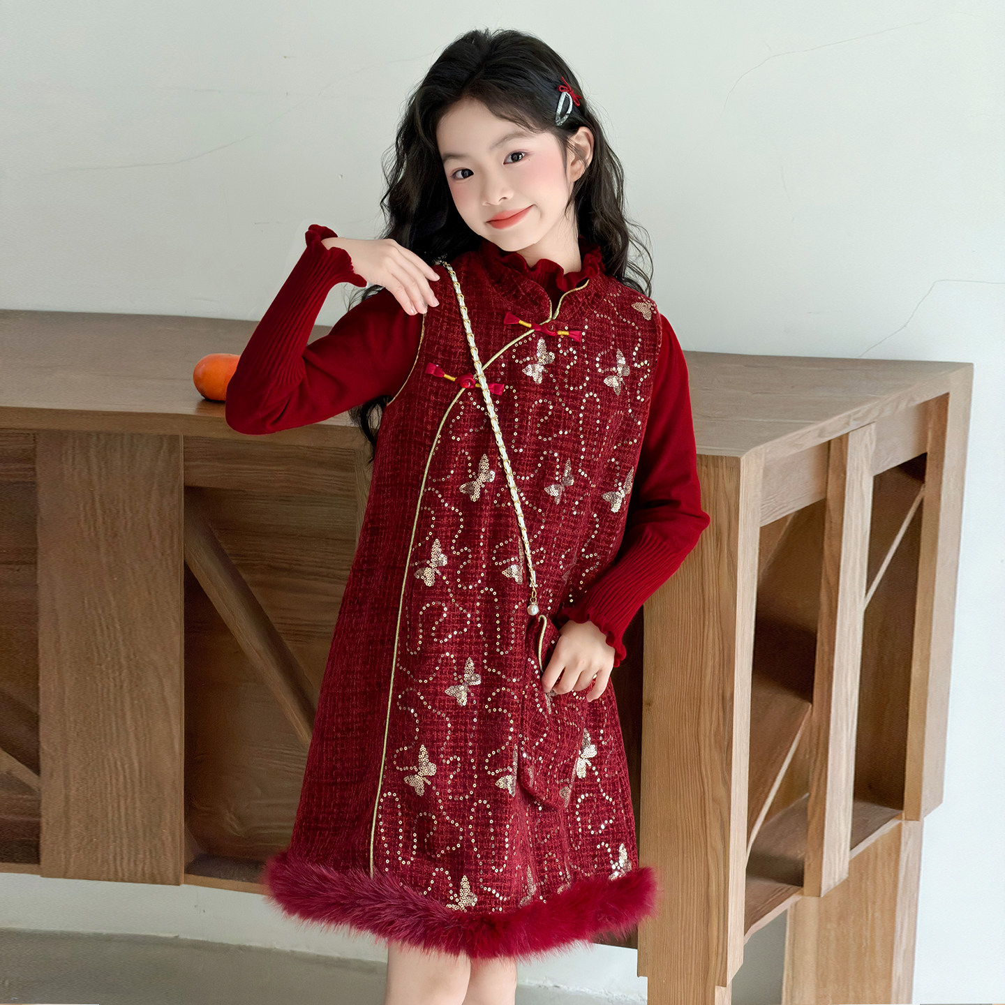 女童冬装套装2025新款时髦洋气红色拜年服儿童国风时尚新年连衣裙