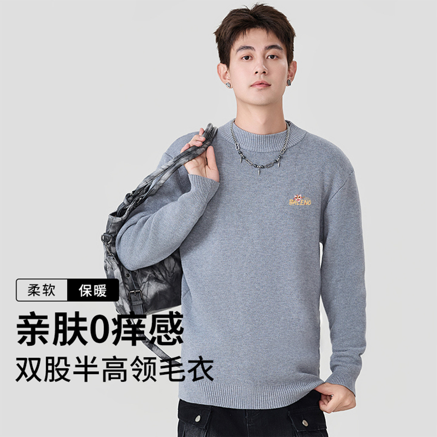 班尼路S&K系列半高领毛衣男款冬季黑色国潮印花高级男士针织毛衫A