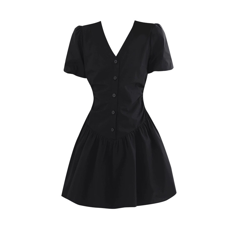 大码胖MM法式气质V领修身短款连衣裙夏季新款泡泡袖显瘦黑色裙子