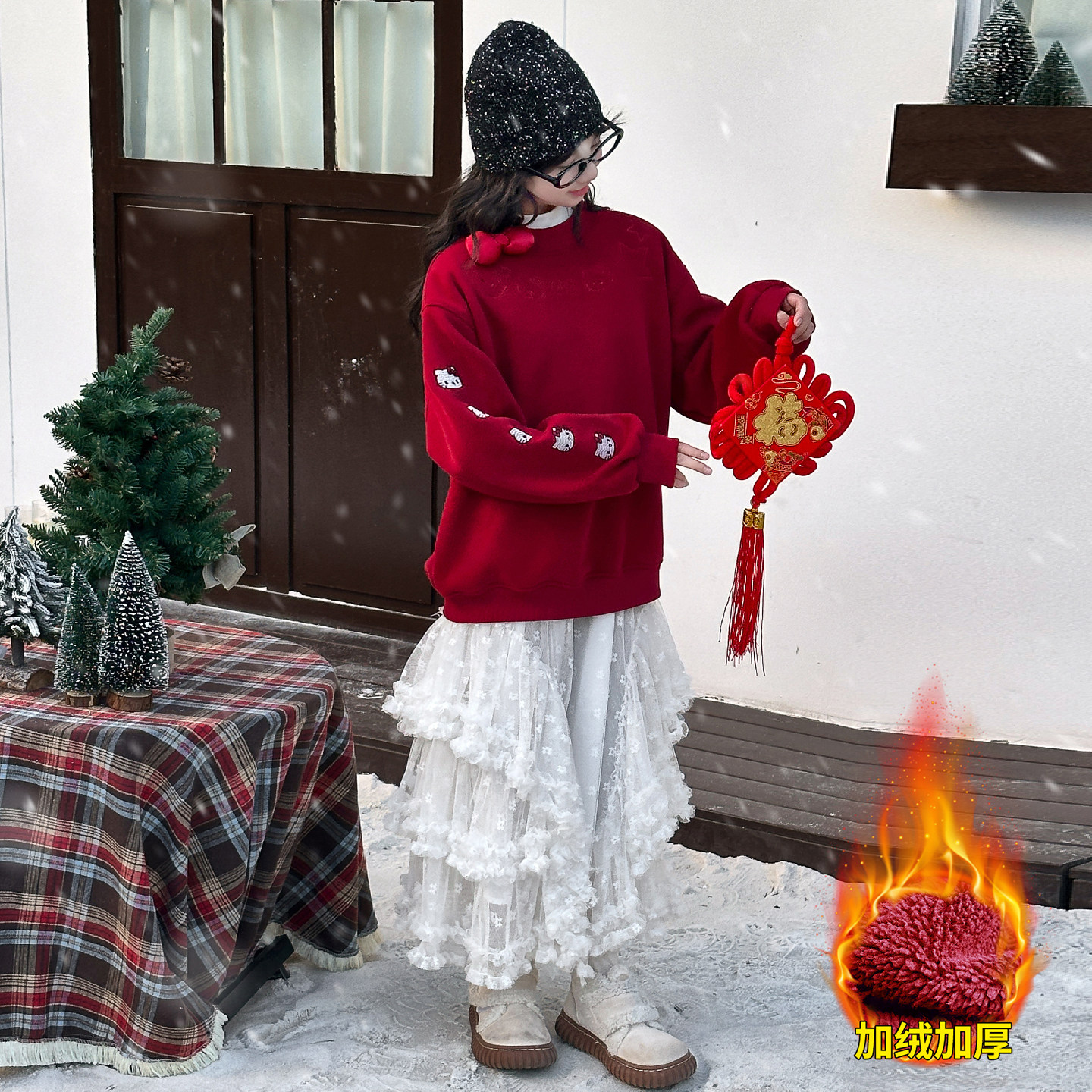女童加厚卫衣冬2025新款初中生女孩冬季新年加绒红色年服上衣冬装
