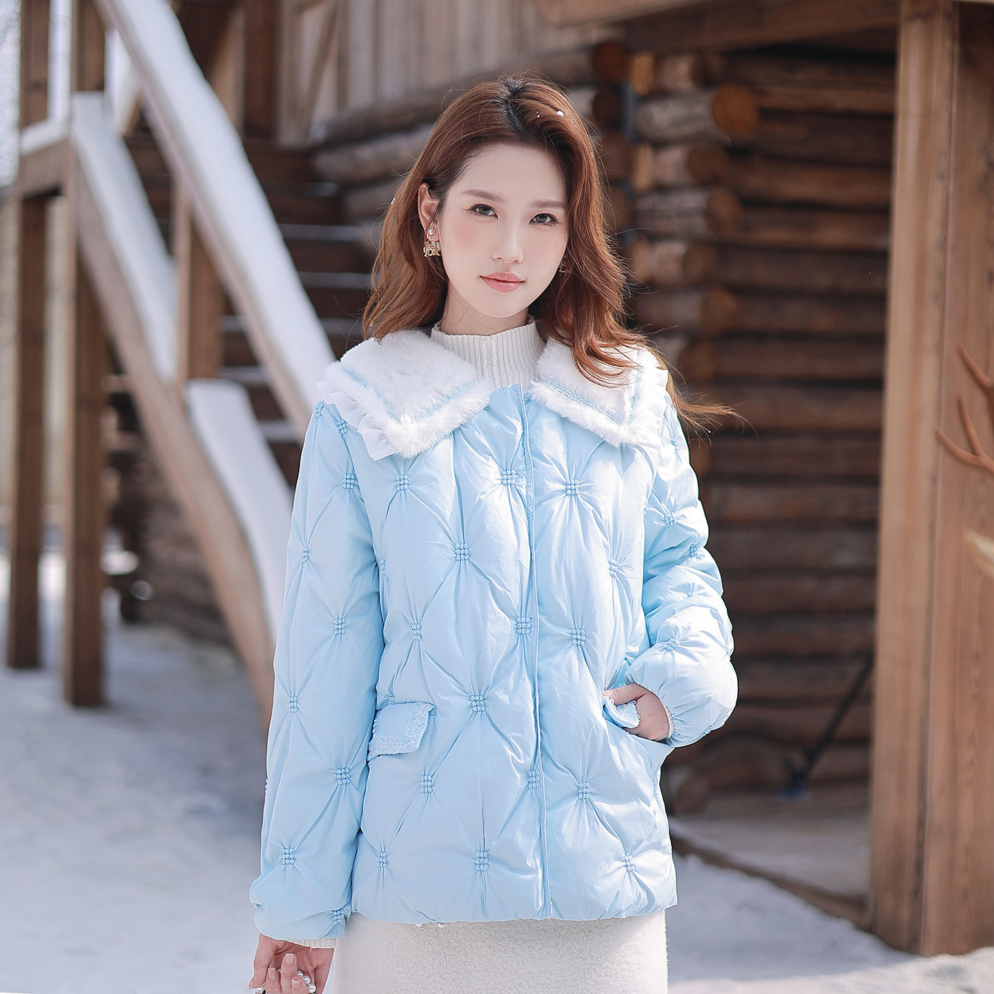 ATAR冬装新款女士木耳拼接毛毛翻领轻薄羽绒服 褶皱修身保暖外套