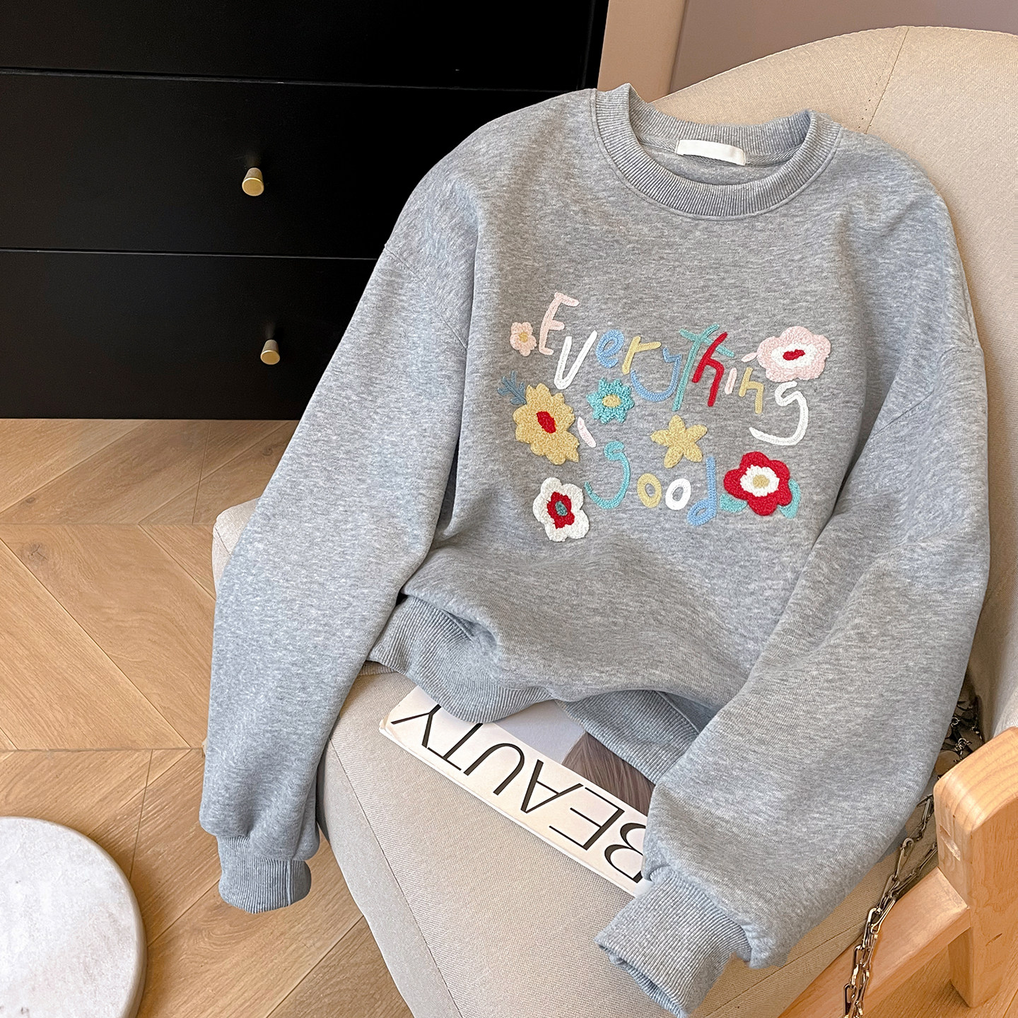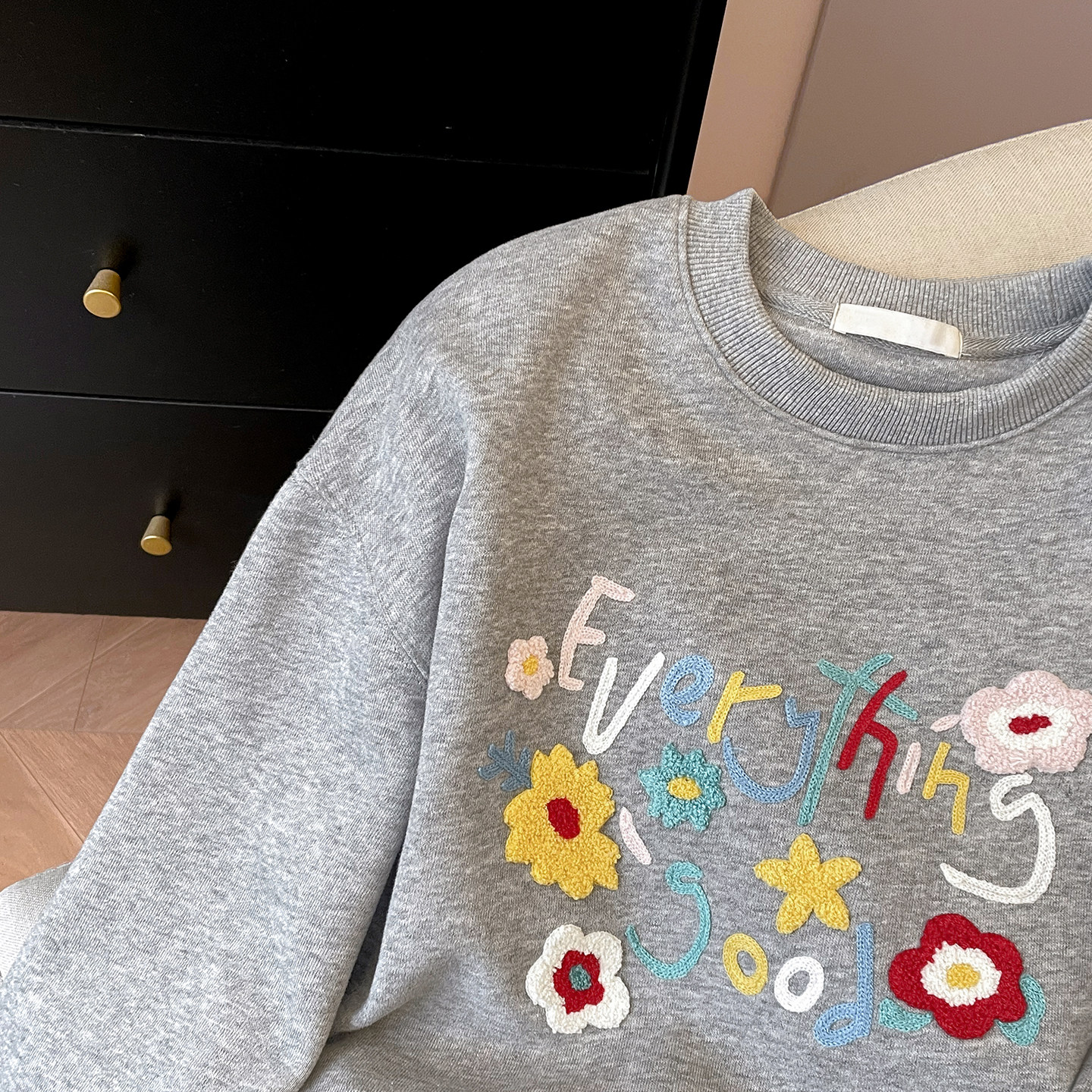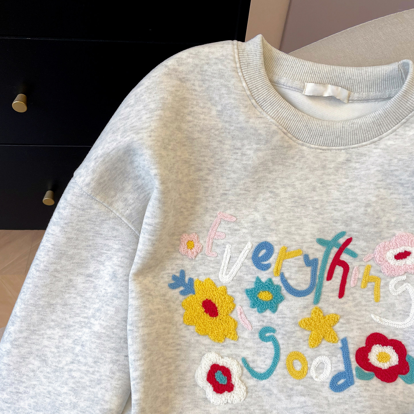 小C家 花朵毛巾绣字母卫衣女款2026新款春季甜美韩系宽松圆领上衣