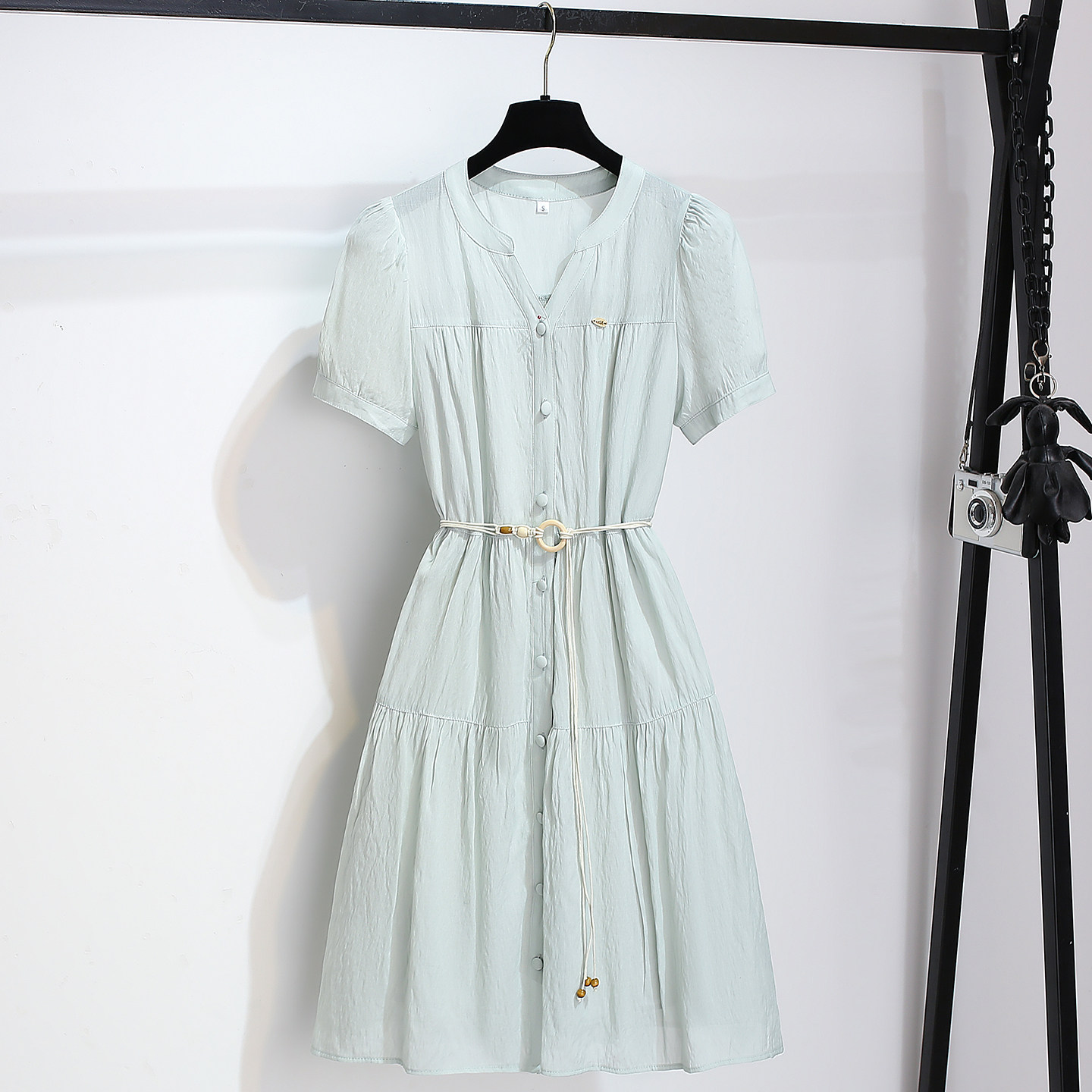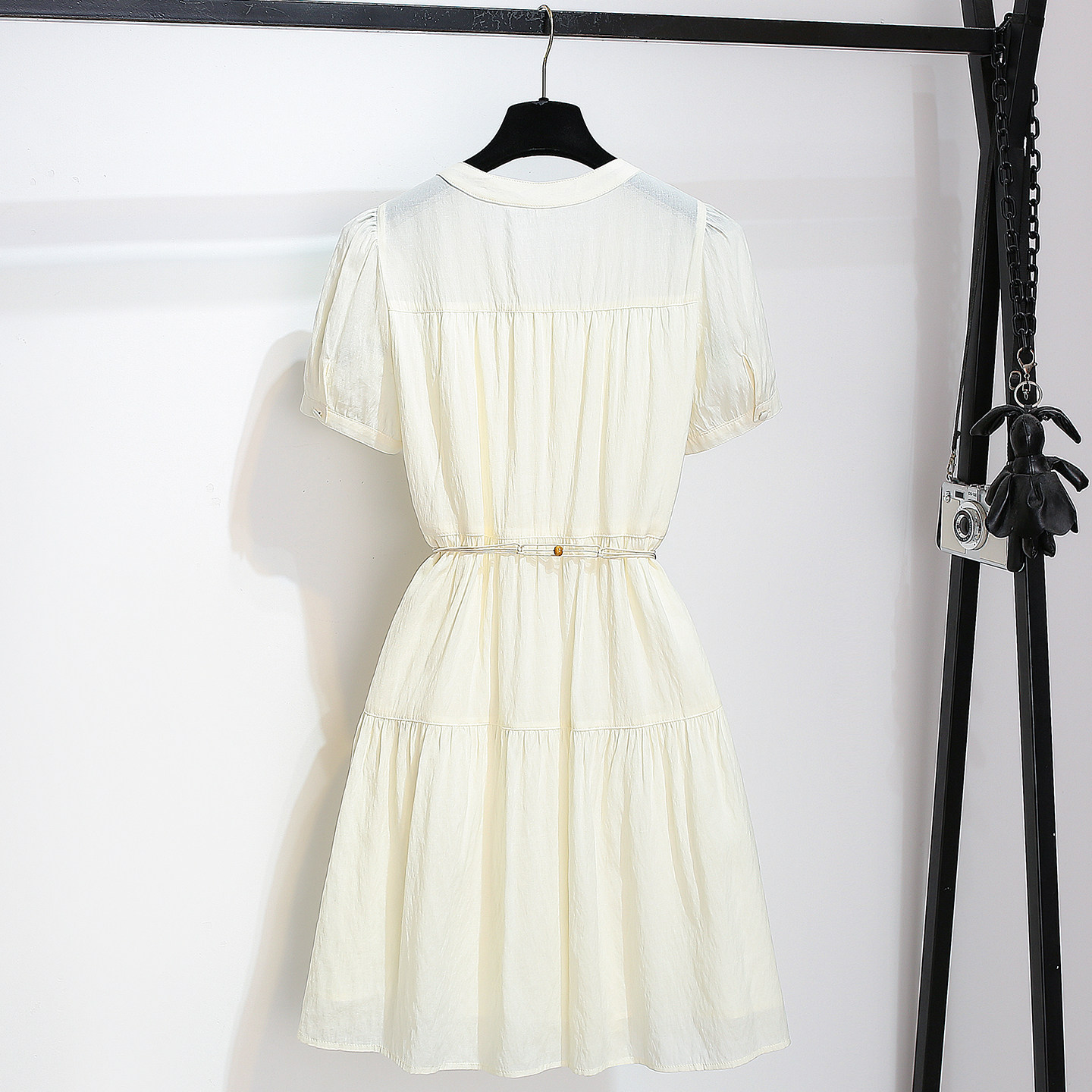 法式V领泡泡袖连衣裙女士2026夏季新款系带掐收腰A字衬衫裙小个子