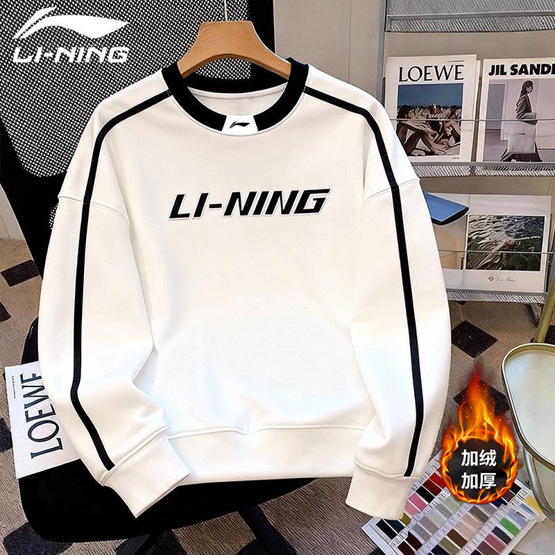 李宁加绒卫衣男士秋冬季新款圆领青少年保暖帽衫加厚白色运动外套