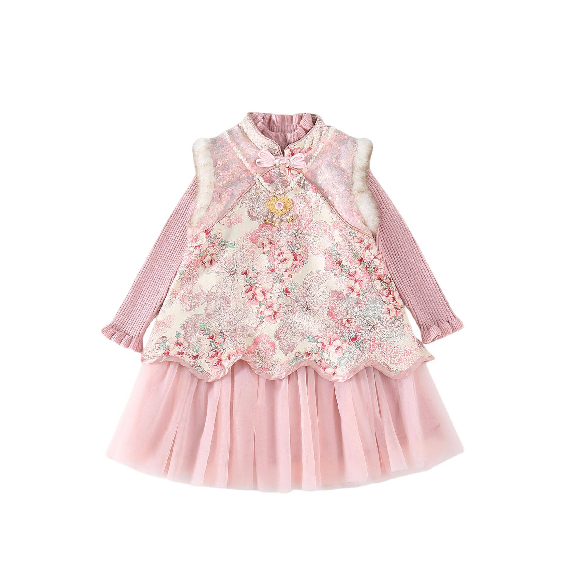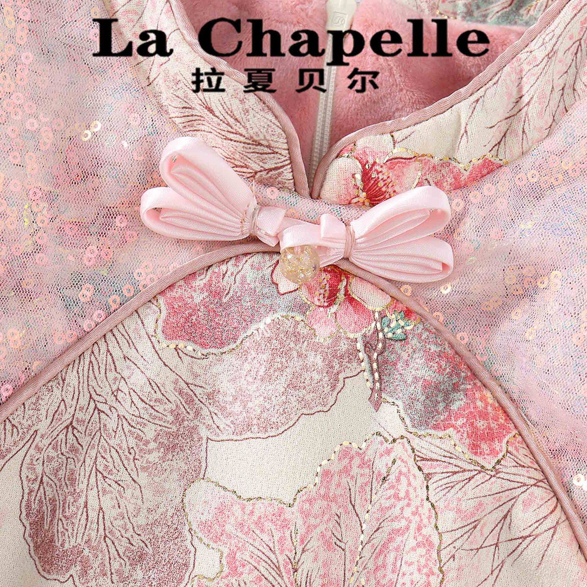 拉夏贝尔女童冬季连衣裙套装新中式国风外套加绒儿童背心裙两件套