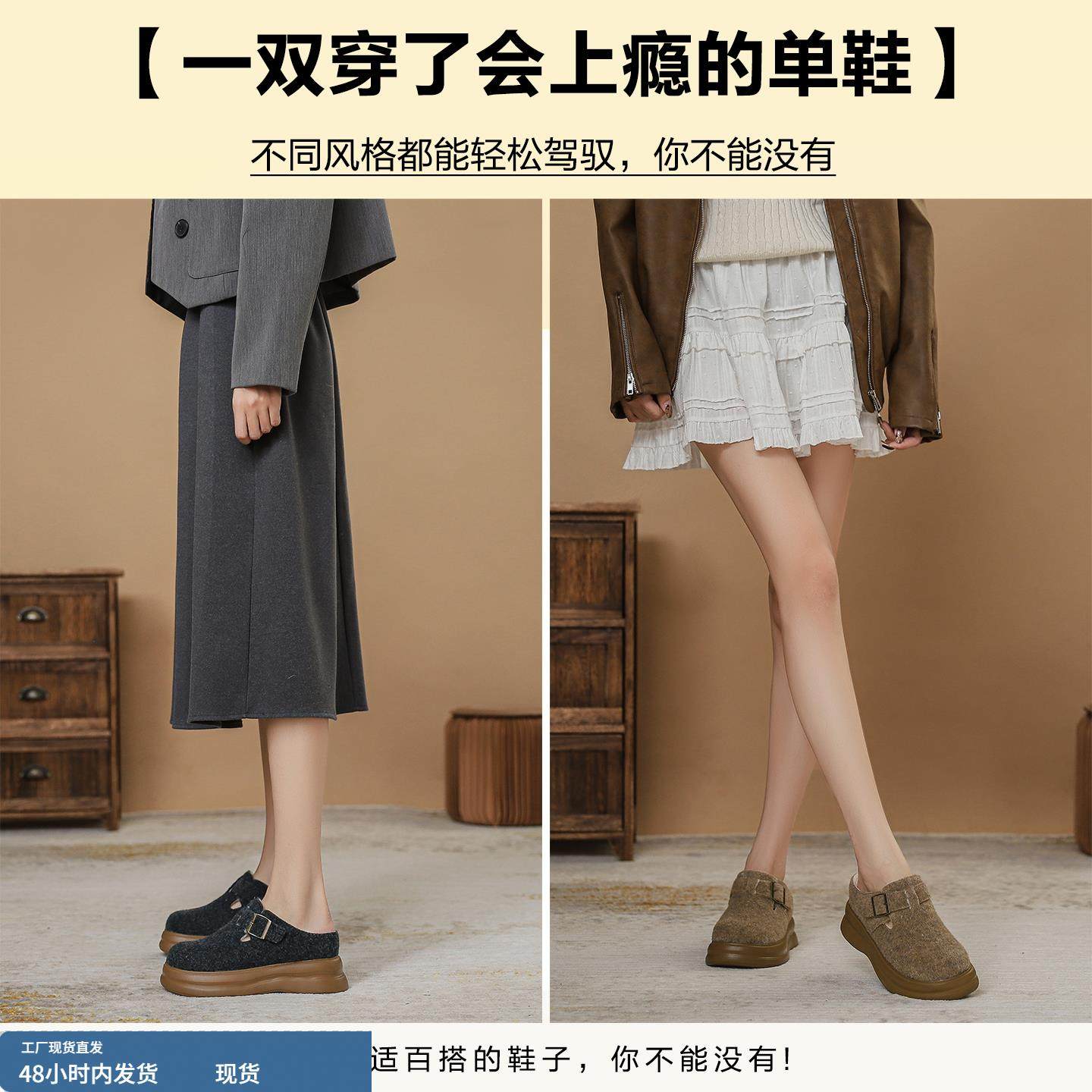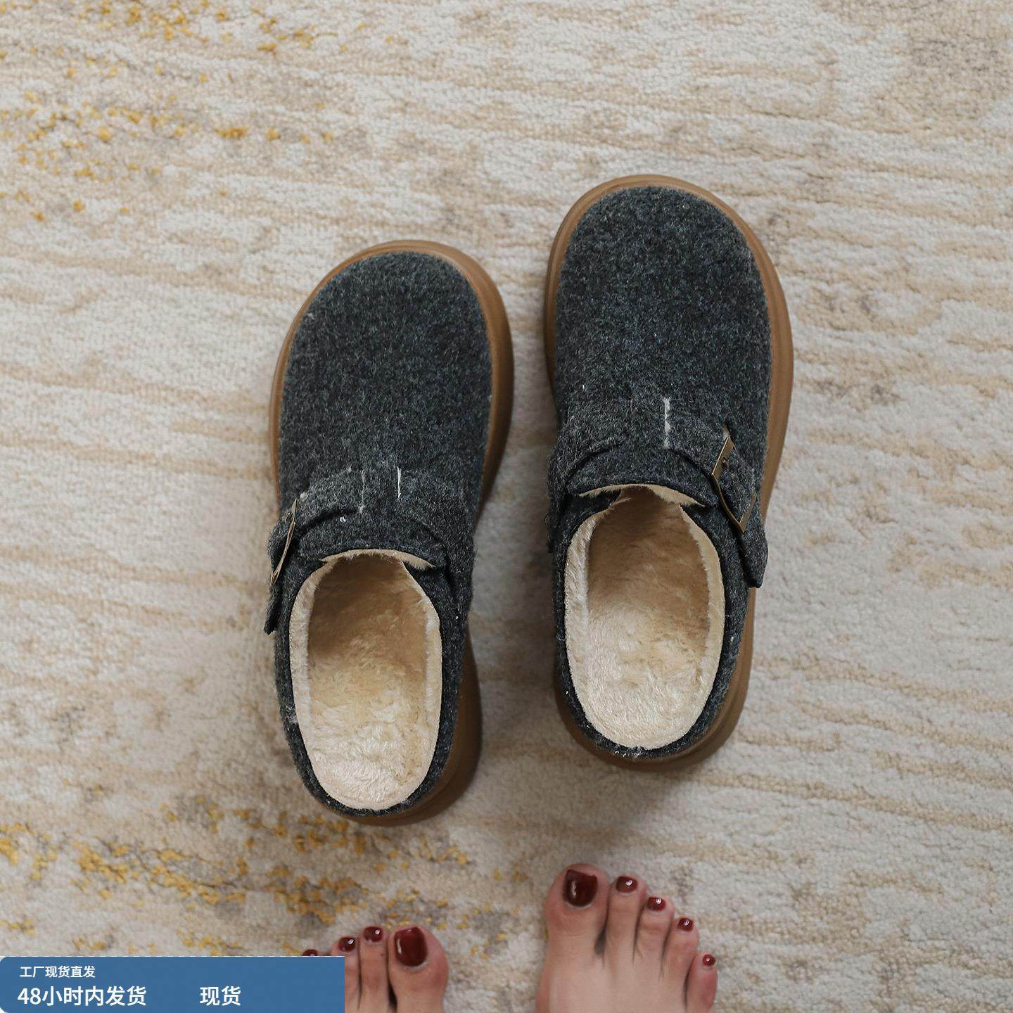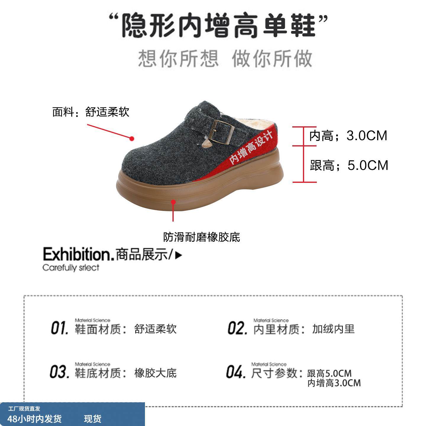 8cm内增高毛毛鞋女冬季加绒棉鞋一脚蹬穆勒半拖鞋厚底毛绒勃肯鞋