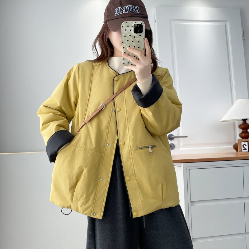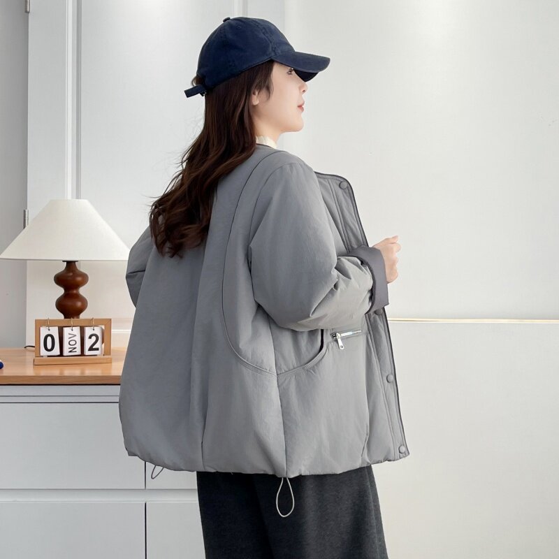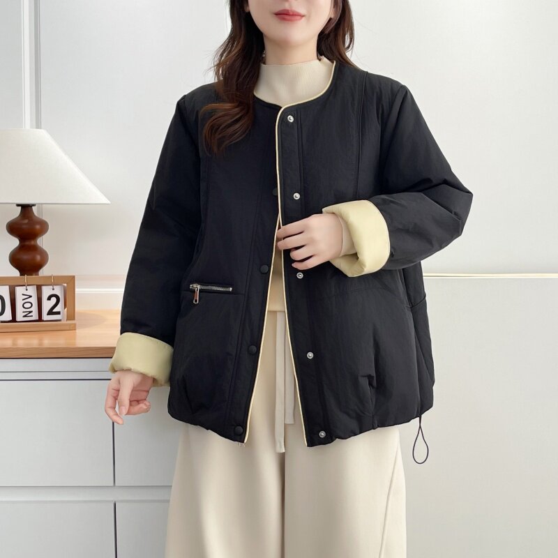 2025大码冬装新款撞色拼接棉服女宽松显瘦圆领拉链棉衣抽绳外套