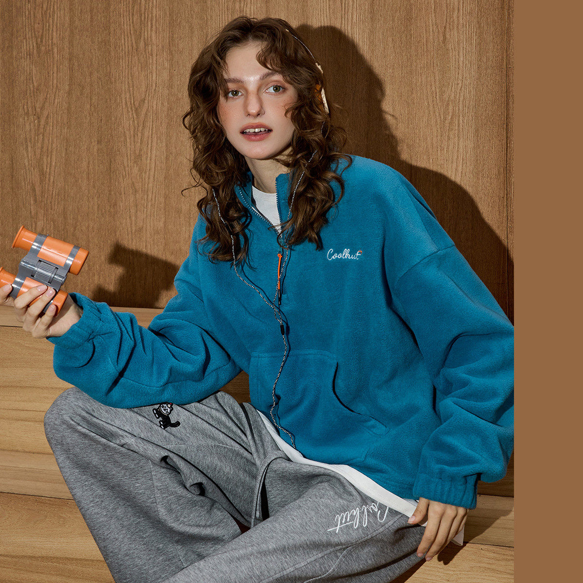coolhut蓝色保暖加绒秋冬新款立领半拉链摇粒绒卫衣外套女款上衣