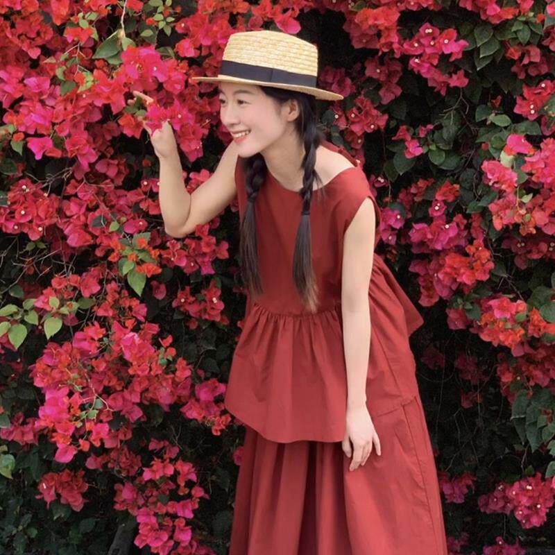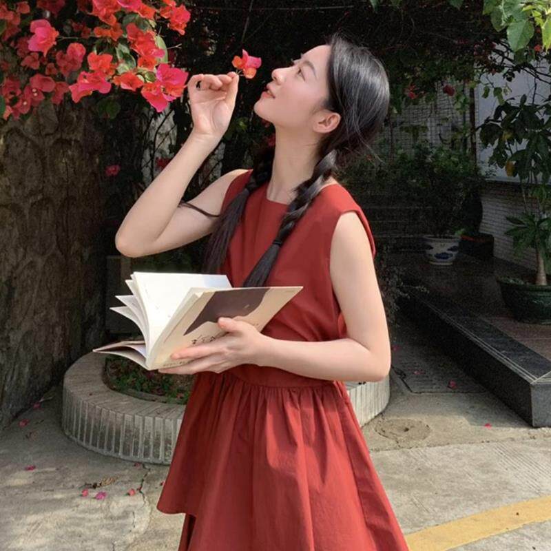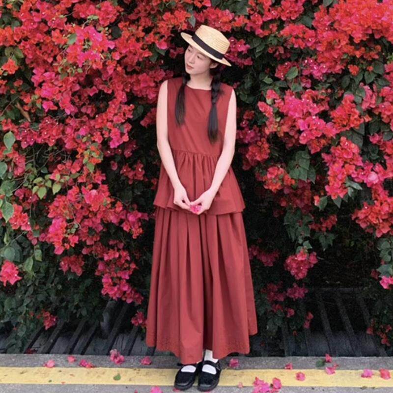 法式红色无袖背心连衣裙女夏季2025新款小个子高级感穿搭套装长裙